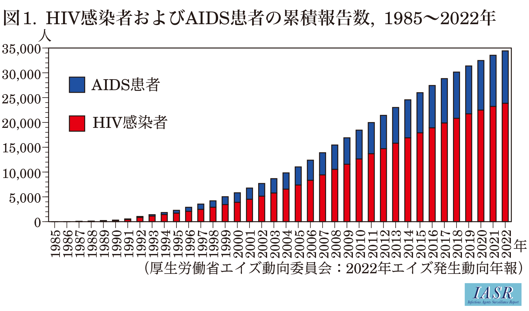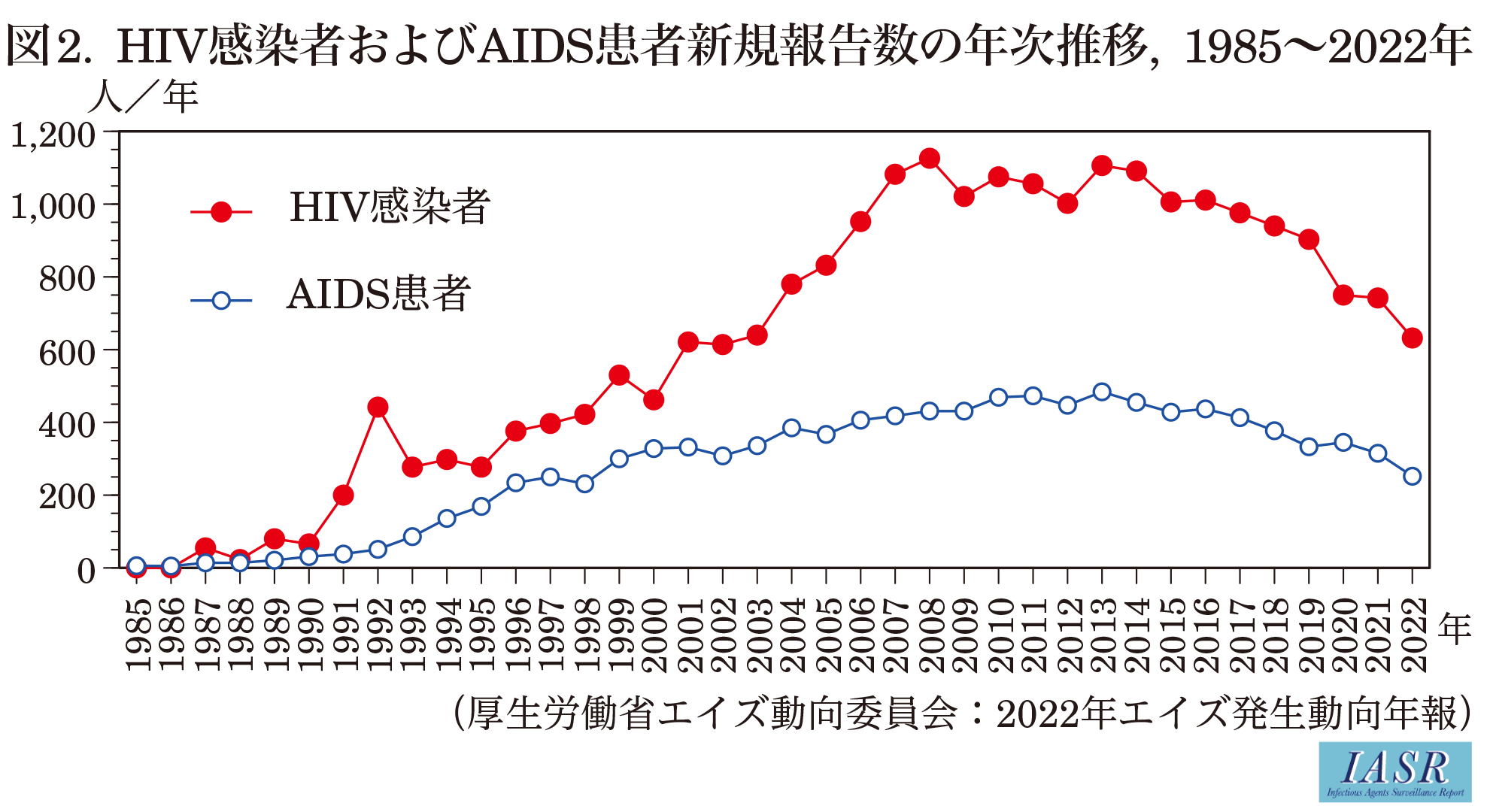 初回報告時にAIDS指標疾患が認められAIDSと診断されたもの(既にHIV感染者として報告されている症例がAIDSと診断された場合には含まれない)。ただし、1999(平成11)年3月31日までのAIDS患者には病状変化によるAIDS患者報告が含まれている。