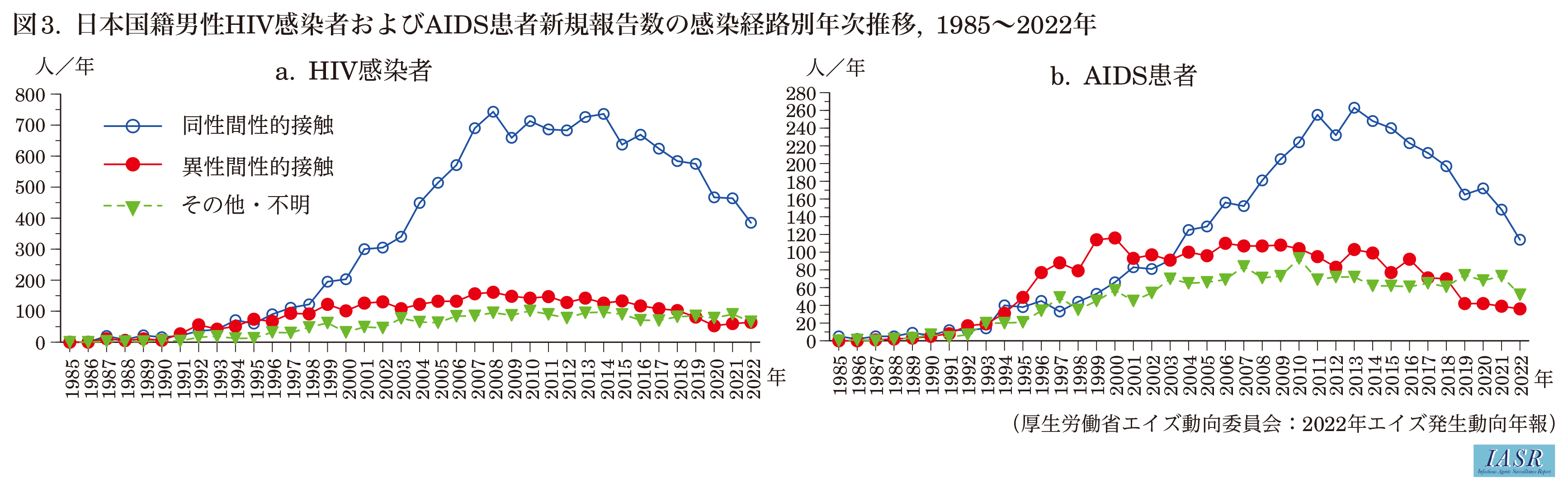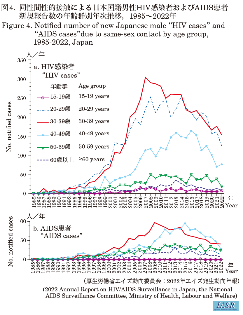 HIV感染者年間新規報告数とAIDS患者年間新規報告数はいずれも前年より減少した。2022年のHIV感染者とAIDS患者を合わせた新規報告数に占めるAIDS患者の割合は28.5%であり、前年より減少したものの2019年の26.9%と比較し高い水準であった。2022年の保健所等における検査件数は、2021年より増加したものの、2019年と比較すると約半数にとどまっている。国内で2020年1月に初めて報告された新型コロナウイルス感染症(COVID-19)の流行にともない、保健所等でのHIV検査が縮小され、検査機会の減少等の影響で無症状感染者が診断に結び付いていない可能性に十分留意する必要がある(IASR 42: 213-215、2021 HIV/AIDS 2020年)。