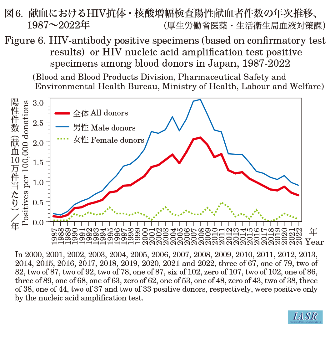 HIV陽性件数および献血10万件当たりHIV陽性件数は近年減少傾向の中で、2020年(献血件数5,024,859件中44件陽性、10万件当たり0.876)は6年ぶりに増加したが、2021年〔献血件数5,086,003件中37件(男性35件、女性2件)陽性、10万件当たり0.727〕、2022年〔献血件数4,994,576件中33件(男性32件、女性1件)陽性、10万件当たり0.661〕は2年連続で減少した(図6)。