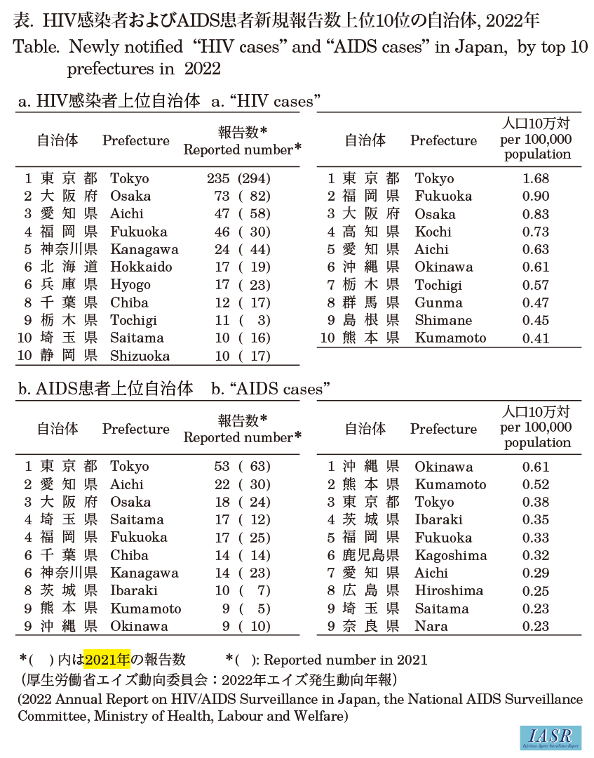 地域別では、東京都を含む関東・甲信越(HIV感染者316、AIDS患者113)、近畿(HIV感染者102、AIDS患者32)、九州(HIV感染者78、AIDS患者45)、東海(HIV感染者67、AIDS患者27)に多い。都道府県の人口10万対では、HIV感染者は東京都が最も多く、AIDS患者は沖縄県が最も多かった〔表: 表の脚注を“注)( )内は20201年の報告数”から“注)( )内は2021年の報告数”へ修正しました〕。