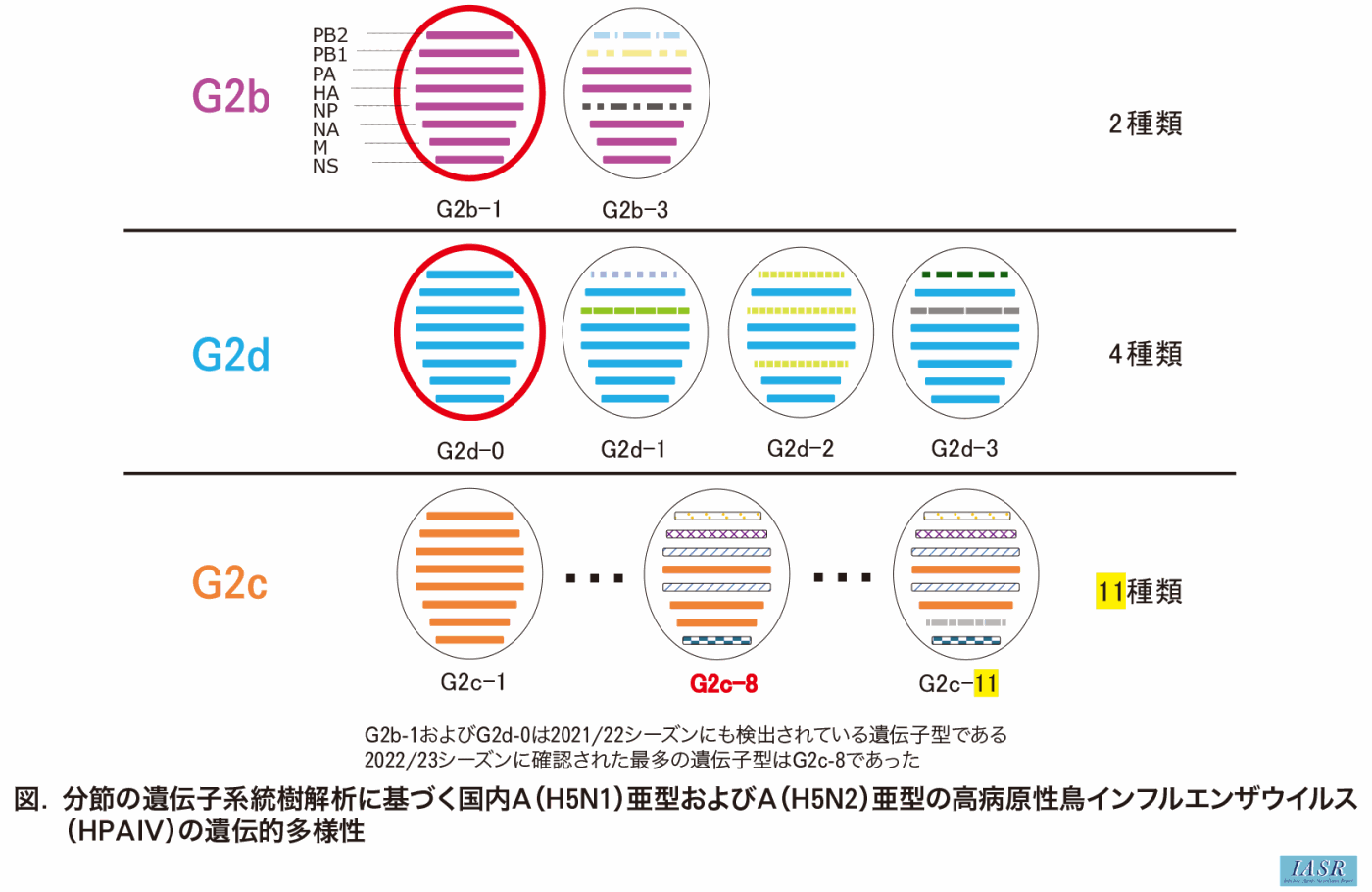 2022/23シーズン最初の発生事例である9月25日に神奈川県伊勢原市の衰弱したハヤブサから分離されたA(H5N1)亜型HPAIVの全ゲノム配列を解読し、A型インフルエンザウイルスが持つ8本の遺伝子分節の組み合わせによる遺伝子型を確認したところ、2021/22シーズンに日本の家禽から分離されたA(H5N1)亜型HPAIVの遺伝子型G2b-1型(図:黄色部分改訂)1)と同じであった4)。ハヤブサのような捕食動物でHPAIVが検出されたことは、感染動物の捕食によるウイルスの伝播を意味する。日本では夏季にウイルスの検出や発生はなく、9月初めより渡り鳥の飛来が始まることから、前シーズンからのウイルス残存よりは、当シーズンに飛来したウイルスを保有する渡り鳥等の捕食による伝播の可能性が高いと考えられた。
