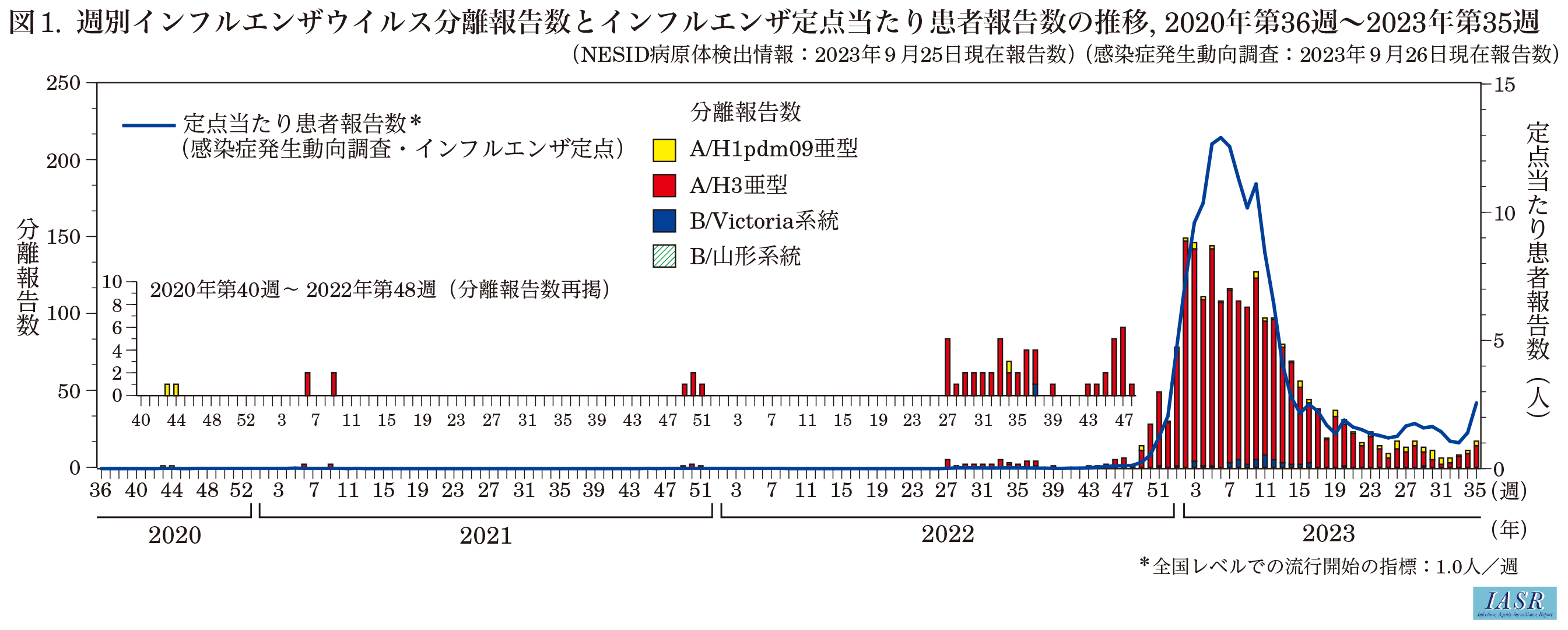 2022/23シーズン(2022年第36週~2023年第35週)のインフルエンザは、報告が非常に低調であった過去2シーズンとは異なり、全国的な流行開始の指標である1.00を上回る定点当たり報告数を認めた。