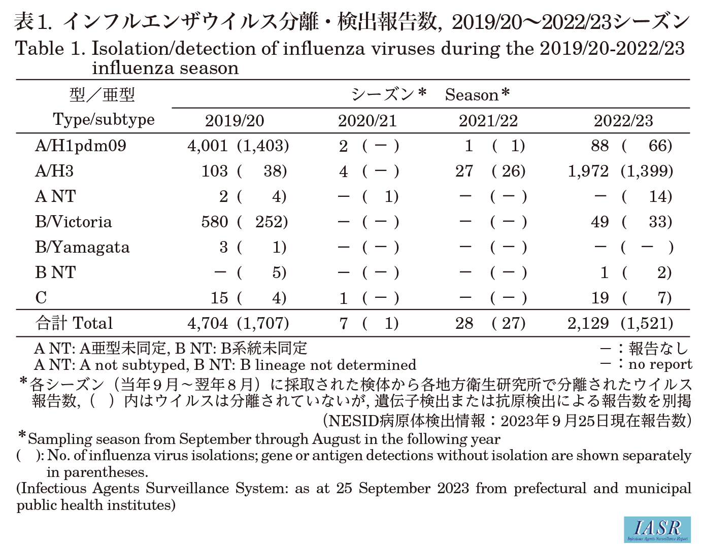 注)IASRのインフルエンザウイルス型、亜型、株名の記載方法は、赤血球凝集素(HA)の分類を調べた情報を主とする場合と、さらにノイラミニダーゼ(NA)の型別まで実施された場合などの違いによるものである。