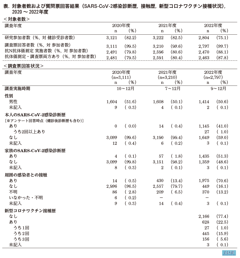 各年度において、健診は5~12月、続く質問票調査は7~12月に実施された。対象者数は2020年度から順に3,121人(82.2%)、3,222人(82.5%)、2,804人(75.1%)〔( )内は各年度健診受診者数比〕で、このうち各年度99.5~99.7%から質問票の回答が得られた。男性が50.1~51.6%であった。本人の診断歴有の割合は、2020年度から順に0%、0.4%、41.0%、家族の診断歴有の割合も同じく0.1%、1.8%、51.3%と、2022年度に大きく増加した(健診後の診断歴も含む、表)。なお、本人の診断歴有の対象者は2021年度では全員に家族の診断歴があったのに対して、2022年度は15.0%で家族の診断歴がなかった。小児のワクチン接種は2022年2月から開始された。2022年度調査において接種歴有は22.5%、うち2回接種が15.9%、3回接種は5.6%であった。