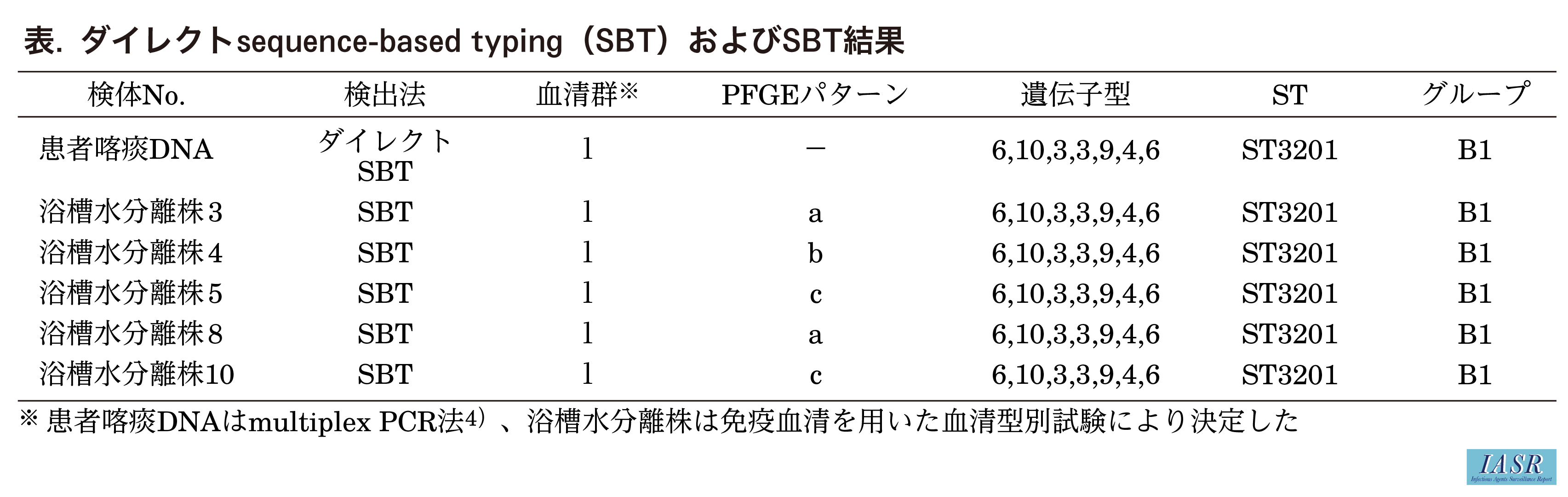 パルスフィールドゲル電気泳動(PFGE)の結果、当該10株は1バンドずつ異なる3群に分類された(図)。患者自宅浴槽水由来5株のSBTはすべて新規シーケンスタイプ(ST)のST3201と決定された(表)。患者喀痰DNAのダイレクトSBTの結果もST3201であった。国内臨床株との比較の結果、ST3201は浴槽水と関連性のある患者から分離されることの多いB1グループに属することが確認された1)。