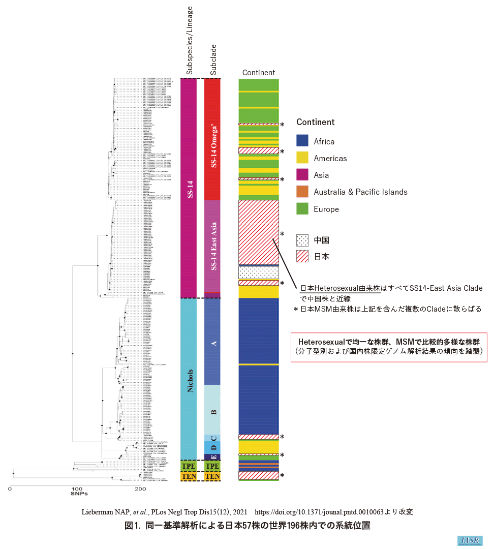 また、この解析での国内株のみに着目し、上記報告7)での系統分類に従うと、大きく4系統「SS14-East Asia」、「SS14-Omega'」、「TEN」、「Nichols-C&E」(細かくは5系統だが、「Nichols-C」と「Nichols-E」の分割は多様なNichols系統株の便宜的細分の意味合いが強い7))に分類され、heterosexual患者由来はすべて「SS14-East Asia」に属することが判明した。また各系統とそのゲノムデータとを比較し、単一遺伝子TP_0705内の3カ所のSNPs(Single Nucleotide Polymorphisms)組み合わせが系統と一意対応することが判明した(図2: webのみ掲載)。これは、ゲノム解析不成立でも、この遺伝子の解析で国内株系統を少なくとも推定できる可能性を示し、簡便系統分類法の観点で有望である。現在、2021年以降の株でも、この対応関係が維持されているか検討を継続している。