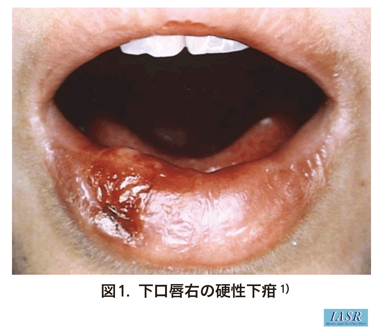 第1期はT.pallidumが侵入した部位にアズキ大~指頭大の、暗赤色で触わると軟骨のようにコリコリと硬い腫瘤の初期硬結が生じる。この初期硬結は数日後に中心部から潰瘍化して硬性下疳となる(図1)1)。梅毒の感染経路の多くは性的接触であるため第1期病変の好発部位は性器であるが、次いで口腔・咽頭、なかでも口唇・舌・口蓋扁桃に生じやすい。初期硬結も硬性下疳も無痛、または違和感のみ訴える場合が多いため、口腔・咽頭の第1期病変は悪性腫瘍と見誤られやすい。