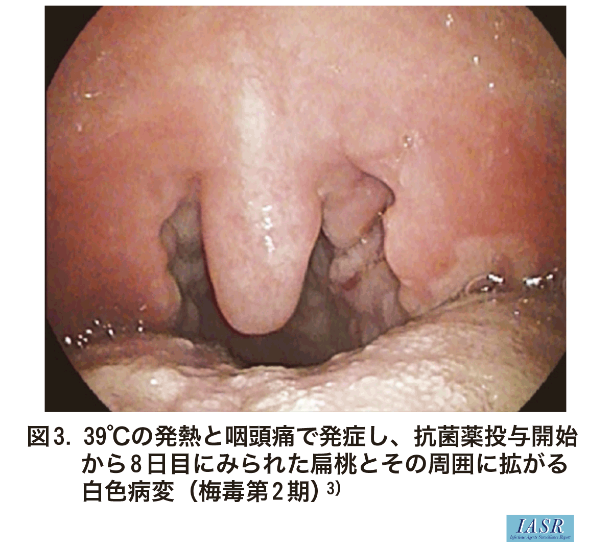 第2期に現れる口腔・咽頭の病変として最も多いのが粘膜斑で、扁平で若干の隆起があり、青みがかった白、または灰色を呈して周囲は薄い赤色の紅暈で囲まれ、ほかの疾患では見られない独特の病変である。粘膜斑が口蓋扁桃から両側の口蓋弓に口峡部に沿って拡大すると、口蓋垂を中心に蝶が羽を広げたような形態“butterfly appearance”(図2)2)を呈する場合があるが、これも梅毒特有の所見である。