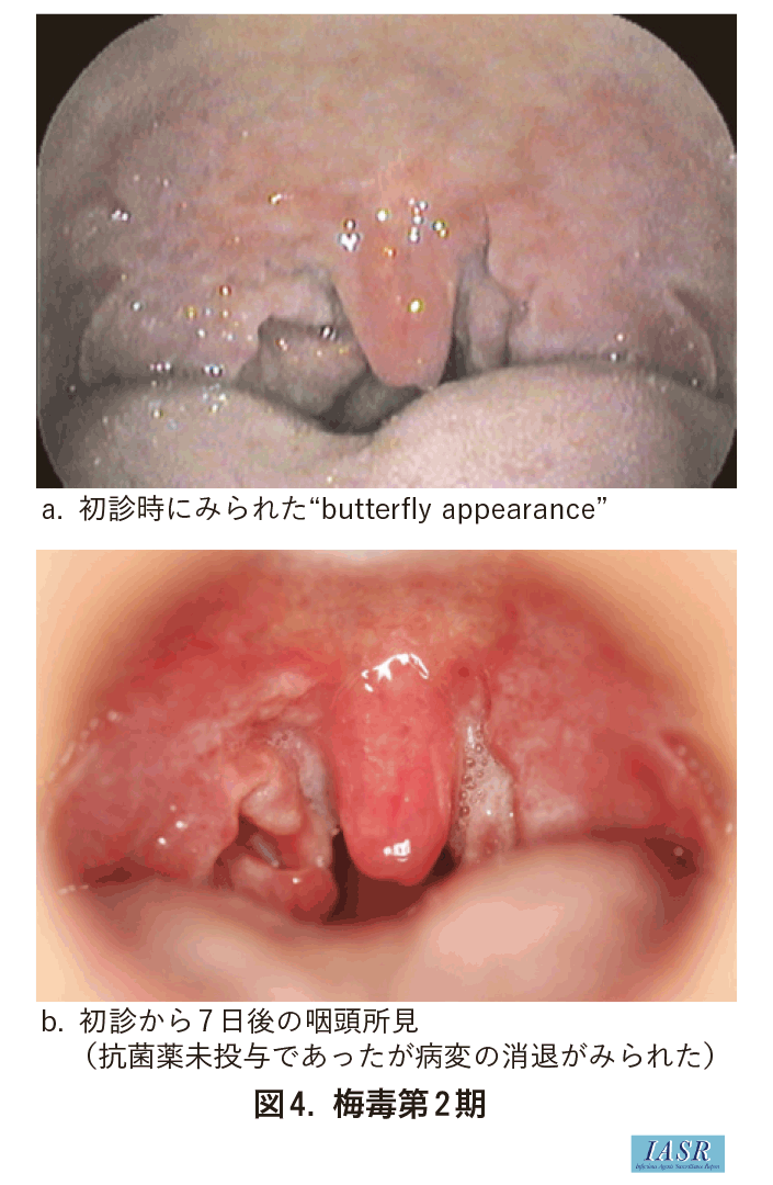 当科で経験した口腔・咽頭梅毒34例のうち、28例は初診時に口腔・咽頭に粘膜斑ないしは白色病変を認め、うち15例は“butterfly appearance”を呈していた。また、30例が咽頭痛・口内痛・喉の違和感を主訴に、内科または耳鼻咽喉科を受診していた。梅毒が急増している昨今、口腔・咽頭症状で発症する梅毒患者も増えていることが懸念される。図2や図4aのような典型的な粘膜斑でなくても、図3や図4bのように扁桃炎様の白色病変が扁桃を越えて周囲に拡がる場合には、梅毒を鑑別診断に挙げるべきである。