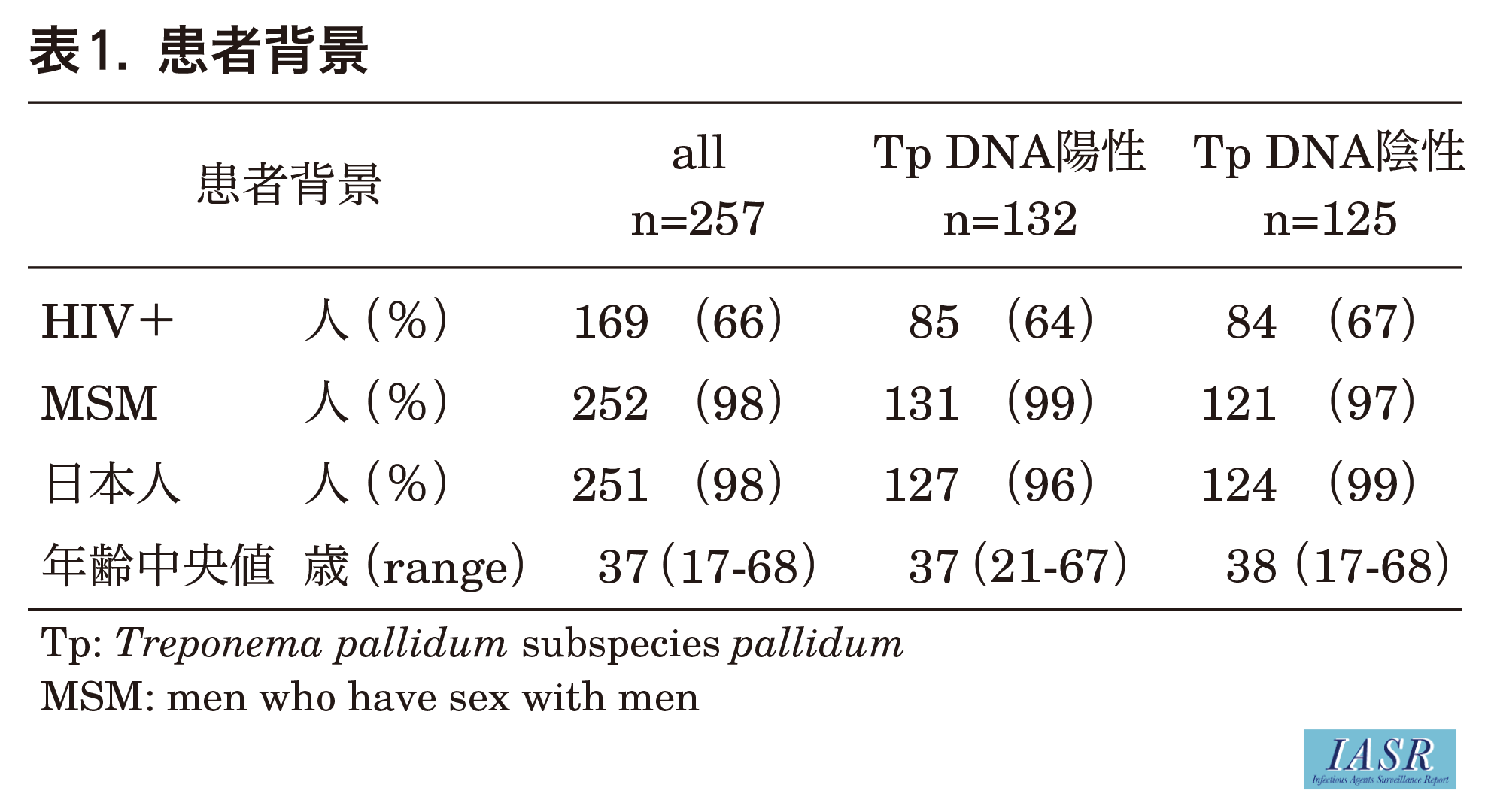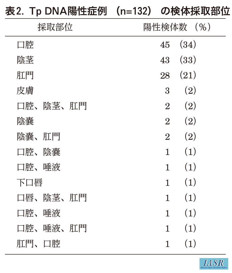 257人中、Tp DNAが陽性であったのは132人、陰性は125人であった。Tp DNA陽性・陰性別の患者背景を表1に示す。全例の66%がHIV陽性で、98%がMSM(men who have sex with men)であった。Tp DNAが陽性であった検体の採取部位を表2に示す。口腔(34%)が最多で、陰茎(33%)、肛門(21%)が続いた。唾液や複数個所からTpが同時に検出された例がみられた。診断別のPCR法の結果を表3に示す。Tp DNA陽性例は、第1期梅毒の75%、第2期梅毒の81%を占めた。