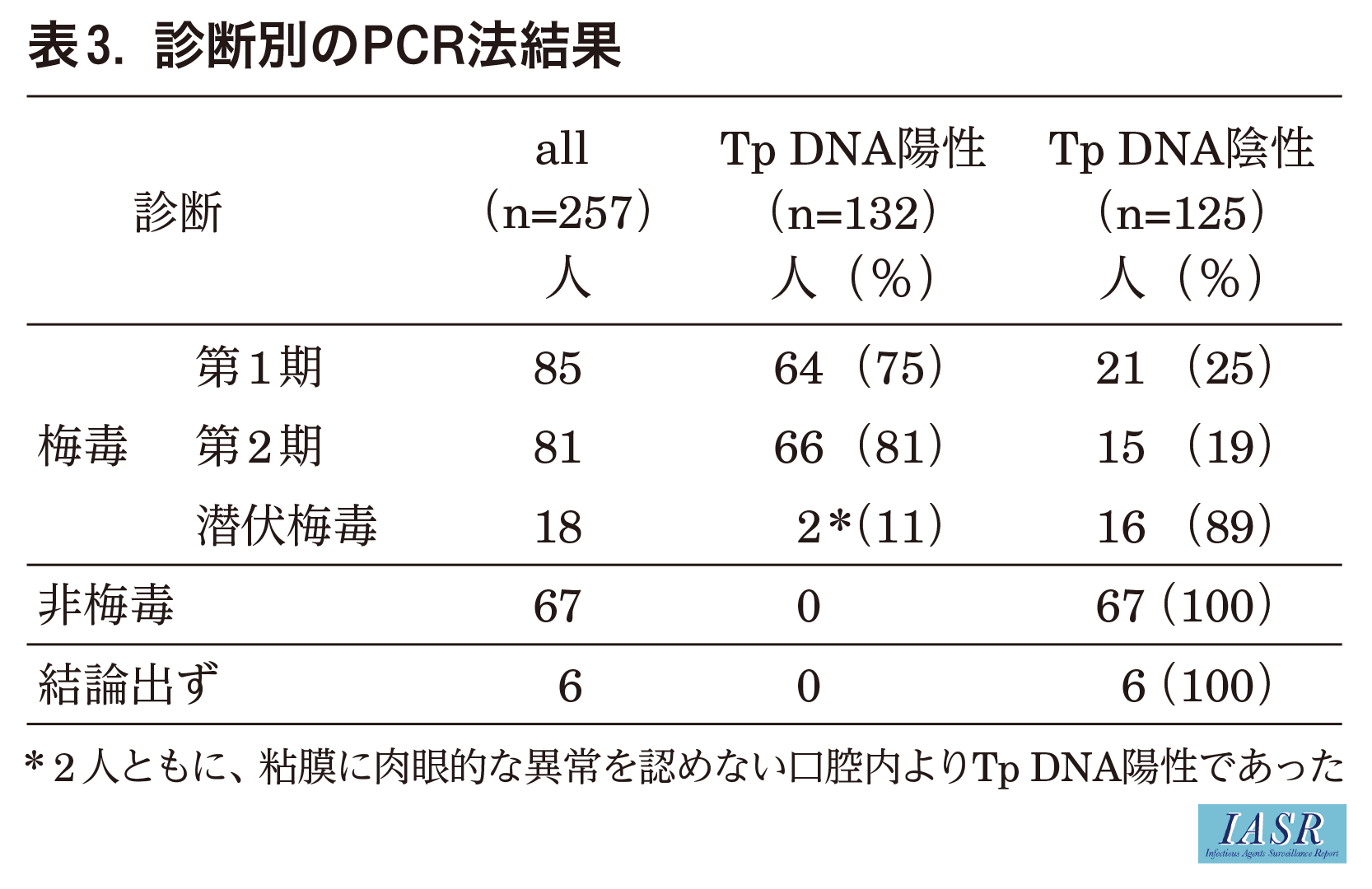 PCR法が特に有用な場面は、血清反応が陰性の第1期梅毒である。表には示していないが、第1期(第2期から第1期へ改訂)でTp DNAが陽性であった64人中、16人(25%)が血清RPRとTP抗体がともに陰性であり、PCR法が診断の決め手となった。しかし、血清反応とPCR法を組み合わせても診断に至らなかった患者が6人存在した。梅毒が疑われた場合、経過を追って血清反応を再検することの重要性は揺らがない。なお、Tp DNAが陽性の場合は梅毒と考えて差し支えないが、陰性の場合は必ずしも非梅毒を意味しないことに注意が必要である。