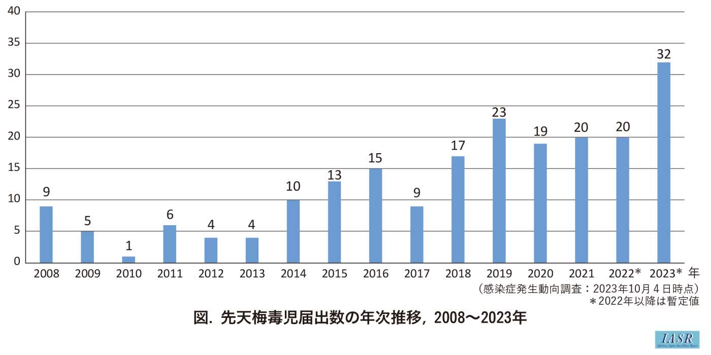 梅毒は、世界中で現在流行している。国内では2022年に梅毒感染者数が、1999年4月に感染症法上の5類感染症の全数把握対象疾患に定められて以来初となる10,000人を突破した。2012年まではMSM(men who have sex with men)の中でわずかにみられていた梅毒が、2013年以降では、女性感染者が急増した。女性感染者の3/4は20~30代であり、若年層が中心である。さらに、母子感染症である先天梅毒が増加している。梅毒合併妊婦は年間200例を超え、先天梅毒は2012年まで年間数例であったものが今では年間20例を超えている。