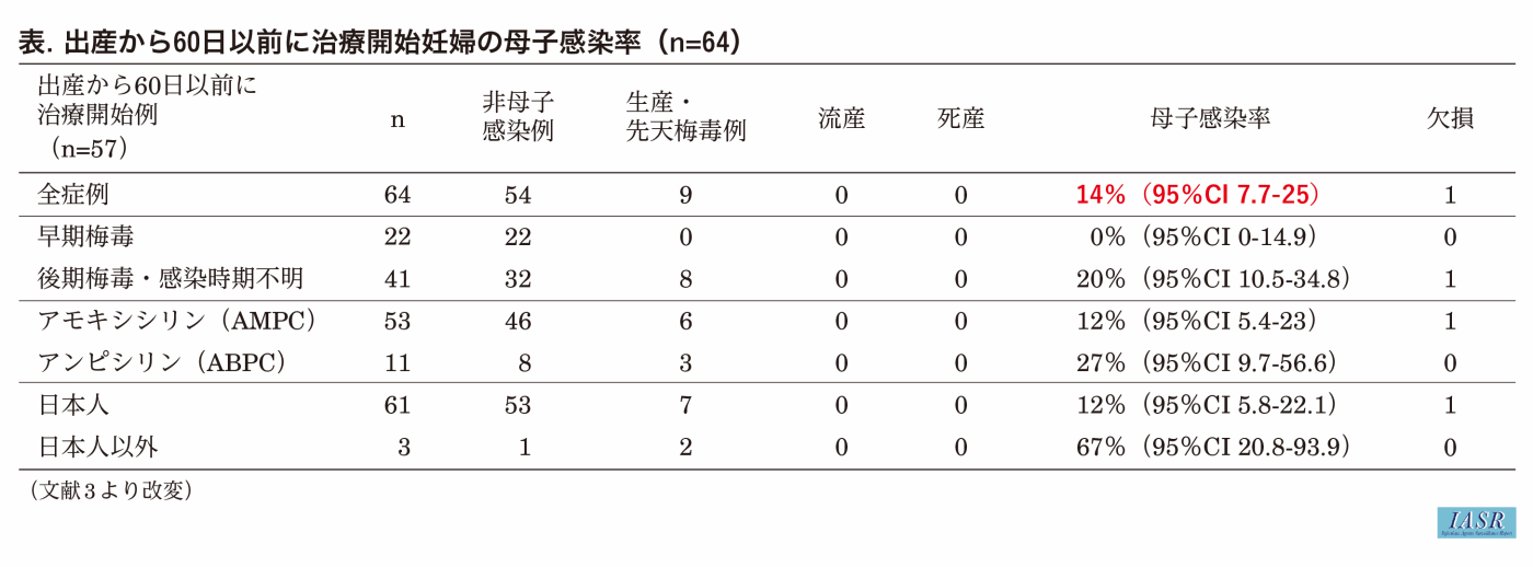 一方、歴史的に経口ペニシリン製剤のみを用いてきた日本では、日本産科婦人科学会を中心としたチームで、経口ペニシリン製剤による母子感染予防効果を調査した3)。80例の梅毒合併妊婦コホートの内訳は、早期梅毒39%、後期梅毒61%であり、アモキシシリン(AMPC)もしくはアンピシリン(ABPC)の内服期間は中央値60日であった。80例のうち、データ欠損を除いた71例中、母子感染例は15例(21%)(生産・先天梅毒13例、死産1例、流産1例)であった。