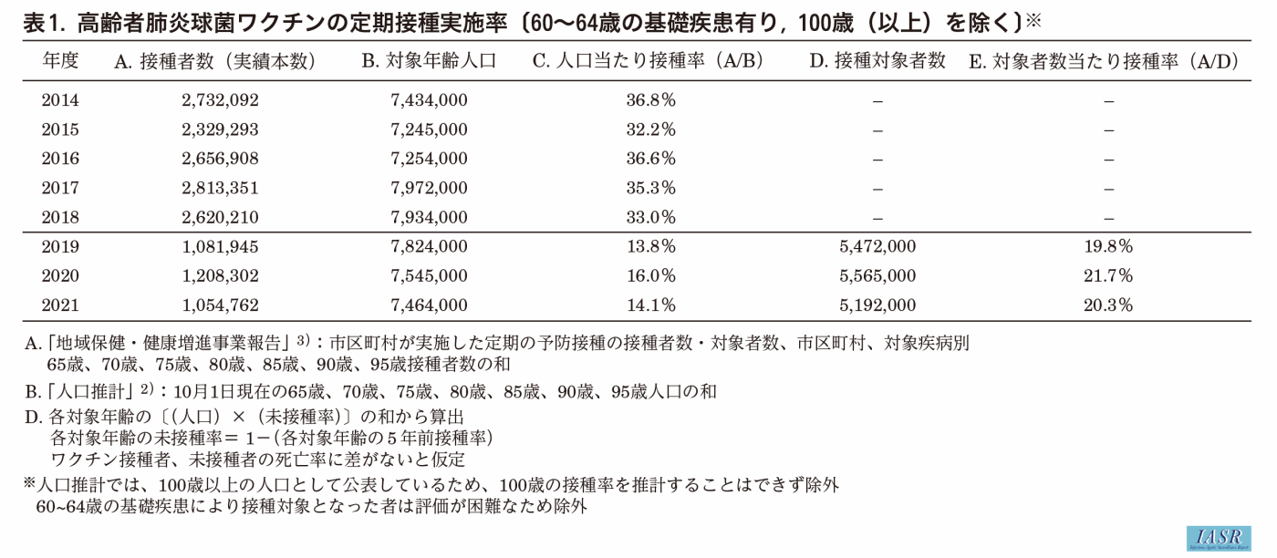 国民の65歳以上の幅広い年齢層約3,600万人に定期接種を円滑に実施するために, 2014年10月~2019年3月までの1期目の5年経過措置として, 各年度に65歳, 70歳, 75歳, 80歳, 85歳, 90歳, 95歳および100歳となる者を接種対象とした(2014年度は100歳以上の者も接種対象)。1期目の5年経過措置の定期接種実施率(以下, 接種率)は32.4-38.3%であり1), 本経過措置において十分な接種機会があったとは言い難いとの理由から, 2019年度以降にも2期目の5年経過措置の継続が決まった。2期目の5年経過措置における接種率は2019, 2020, 2021年度のそれぞれで13.7%, 15.8%, 14.0%と低下した1)。このうち, 65歳の者と, 60歳以上65歳未満の者であって前述の基礎疾患を有する者の接種率は36.8-39.8%であった1)。しかしながら, 2期目の接種率の算出において, 1期目で接種済みの者は除外されていない人口当たりの接種率とされており, 接種対象者数当たりの接種率は把握できていない。このため, 高齢者の侵襲性肺炎球菌感染症の発生動向に対する2期目の5年経過措置を含む定期予防接種制度を十分に評価できない。
