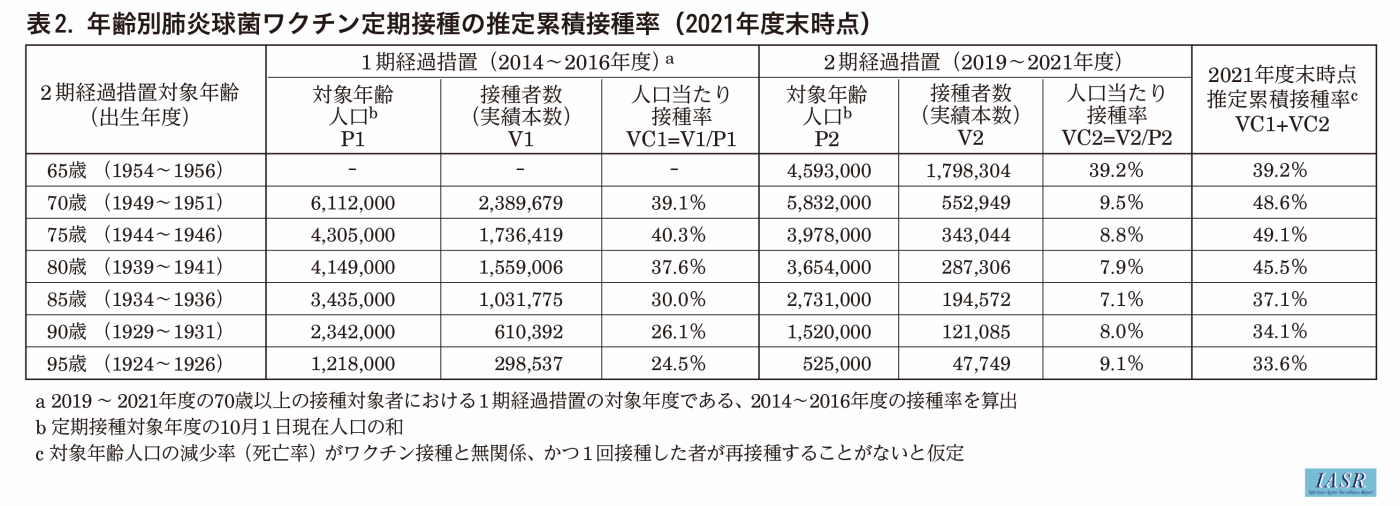 2023年8月時点でe-statにて公開されている2014~2021年度の年齢別接種者数2)および各年の年齢別10月1日時点人口3)を用いた。表1には高齢者肺炎球菌ワクチンの各年度の定期接種率の推計を示した。各年度の接種者数と人口推計値から人口当たり接種率(表1の項目C)を算出した。2期目の5年経過措置にあたる2019~2021年度には, 初めての接種機会となる65歳は人口を, 2回目の接種機会となる70歳以上の各対象年齢は, 各対象年齢の人口に1期目の未接種率を乗じた各年齢の接種対象者の和から各年度の接種対象者数(表1の項目D)を算出し, 対象者数当たり接種率(表1の項目E)を算出した。表2には2021年度末時点の年齢別の推定累積接種率を以下のように算出した。ある年齢コホートの1期経過措置期間(2014~2016年度)における人口をP1, 接種者数(接種実績本数)をV1, 人口当たり接種率をVC1, 2期経過措置期間(2019~2021年度)におけるそれらをP2, V2, VC2とすると, VC1=V1/P1, VC2=V2/P2となる。時間経過によりコホート人口は減少するが(P1>P2), 減少率(死亡率)がワクチン接種と無関係であり, かつ1回接種した者が再接種することがないと仮定し, 2期経過措置期間終了時点における推定累積接種率はVC1+VC2とした。表3には2期目(2019~2021年度)の年齢別対象者数当たり接種率を算出した。なお, 5年経過措置1期目(2014~2018年度)の全年齢の者および2期目(2019~2021年度)の65歳の者の対象者数当たり接種率は, 初回の接種機会であることから, 人口当たり接種率として算出した。
