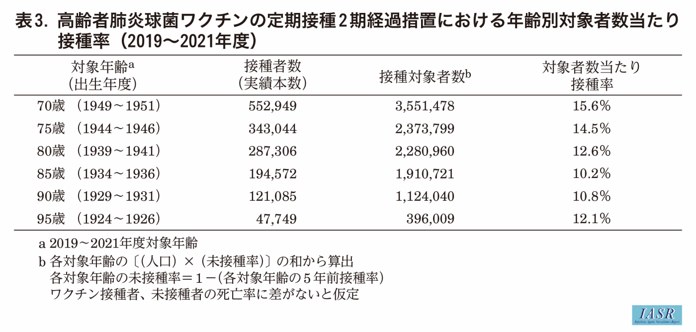 今回算出した2019~2021年度の接種対象者当たりの接種率は19.8-21.7%であり, 人口当たりの接種率(13.8-16.0%)では約6%過小評価となっていた(表1)。年齢(出生年度)別に接種状況をみると, 2期目の経過措置となる70歳以上の各年齢の対象者数当たり接種率は10.2-15.6%と低いものの(表3), 推定累積接種率は1期目の経過措置で24.5-40.3%から2期目の経過措置で33.6-49.1%へ上昇している(表2)。肺炎球菌性肺炎や侵襲性肺炎球菌感染症(IPD)のリスクは加齢によって高まることが知られているが4,5), 推定累積接種率は85歳以上で低下傾向であった。また, 2019~2021年度の富山県内の2自治体における定期接種実施率は, 65歳では40-50%, 70~100歳では15-20%であった6)。富山県内の2自治体の定期接種実施率は今回の65歳および70歳以上の全国の定期接種実施率の推計値と比較して約5%高い結果であった。富山県内では対象者への個別通知を行っているのに対し, 今回算出した全国での定期接種実施率の推計値では, 接種対象者への個別通知を実施していない自治体が一定数含まれる可能性が考えられた。この接種対象者への個別通知がない場合は, 定期接種実施率が低下する可能性がある。