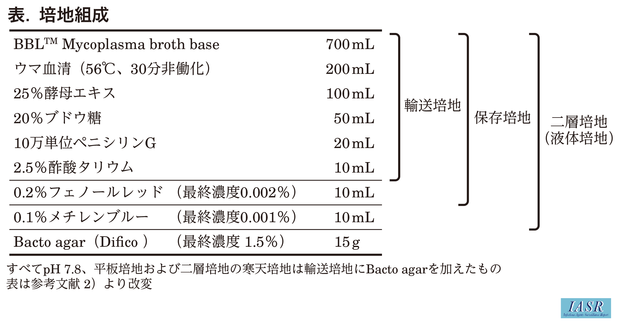 肺炎マイコプラズマ(Mycoplasma pneumoniae: M.pneumoniae)の培養は時間を要し、操作も煩雑なことから検査を実施している施設は少ない。神奈川県衛生研究所(以下、当所)では、これまで分離培養および菌株収集を行ってきた。今回、一例として当所で実施している検査法を紹介する。各検査法の詳細は国立感染症研究所のウェブページに掲載の「肺炎マイコプラズマ(Mycoplasma pneumoniae)検査マニュアル1)」(以下、感染研マニュアル)およびその他の参考文献を参照されたい。なお、当所で使用している培地の組成については、岡崎らの方法に準拠しており、下表に示した2)。