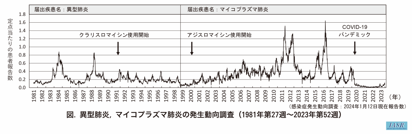1999年4月以降は、感染症法の改正によって現行の感染症発生動向調査となり、マイコプラズマ肺炎の調査が現在まで継続している〔5類感染症、定点把握疾患に位置付けられており、全国約500カ所の基幹定点医療機関(小児科および内科医療を提供する300床以上の病院)から毎週患者数(入院・外来の総数)が報告されている〕(図)。この調査では、2006、2010、2011、2012、2015、2016年に患者発生の増加がみられ、報告数が0.6人/定点を超える週があった。特に2011、2012、2016年は報告数が1.3人/定点を超える週もあり、調査開始後の過去の水準と比べても、報告数の多い流行年であった。2020年も4月までは例年より報告数が多い状況で推移し、2016年以来4年ぶりの大きな流行年になる可能性もあったが、5月以降は報告数が激減した。新型コロナウイルス感染症(COVID-19)パンデミックによって、社会全体でマスクや手洗いなど感染防止策が強化されたことなどが影響したと思われる。2020~2022年は、毎年起こる秋冬期の季節性の報告数増加もみられなかった。2023年末の時点でも、報告数は少ない状況で推移している。