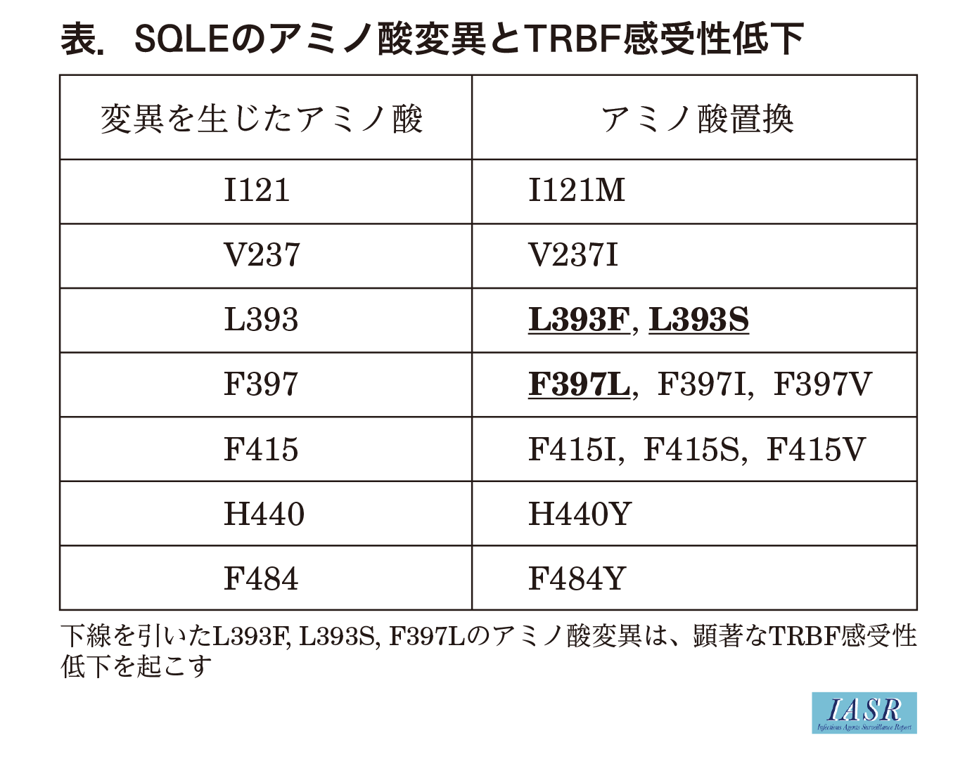 TRBF耐性化を評価するうえでSQLE遺伝子の変異を調べることは有用であり、今回の調査では2種類のアミノ酸置換が確認された。実際にはSQLEのアミノ酸変異には多数のパターンがあるが3,4)、顕著な感受性低下を起こすのはその一部だけである(表)。