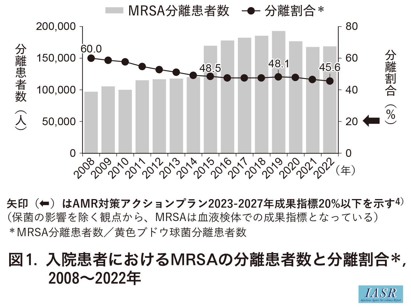 2022年の公開情報JANIS検査部門年報1)によると、入院患者における黄色ブドウ球菌分離患者数に占めるメチシリン耐性黄色ブドウ球菌(methicillin-resistant Staphylococcus aureus:MRSA)分離割合(以下、MRSA分離割合)は45.6%であった(図1)。2008年以降、JANIS参加医療機関数増加に付随した検体提出患者数の増加にともない、MRSA分離患者数も増加傾向を示したが、2019年をピークにやや減少している2)。それに対して、MRSA分離割合は2008年の60.0%から減少傾向を示しており、2020年の新型コロナウイルス感染症(COVID-19)流行期以降も減少が続いている(図1)。