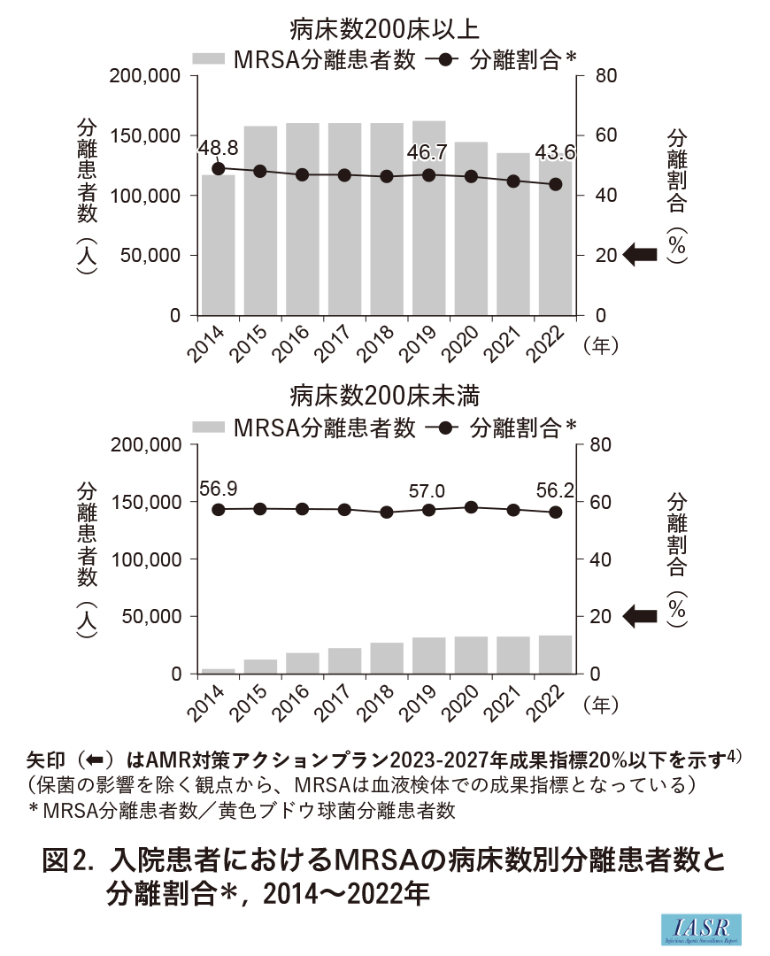 2014年には、診療報酬の改定とともに病床数200床未満の医療機関もJANISへの参加が可能となった。その影響で、2015年以降には参加医療機関数の増加がみられ、MRSA分離患者数も増加している。しかし、200床以上と200床未満の医療機関に分けて集計すると、MRSA分離割合は200床以上の医療機関においては減少傾向を示し、2022年は43.6%であった。一方、200床未満の医療機関においては56%強で推移し、施設特性の違いが顕著に認められた(図2)。