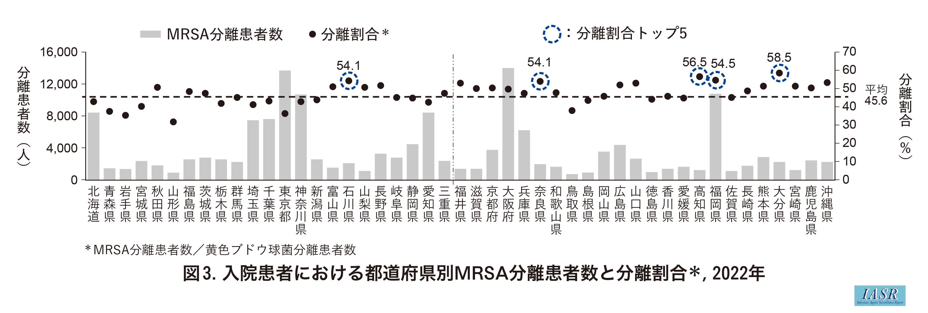 また、都道府県別に2022年のMRSA分離割合をみてみると、全国平均の45.6%を超えた都道府県数は、東日本が8県であったのに対して西日本は19府県(p<0.05)であった。さらにMRSA分離割合の高かった上位5県のうち、4県が西日本であった(図3)。