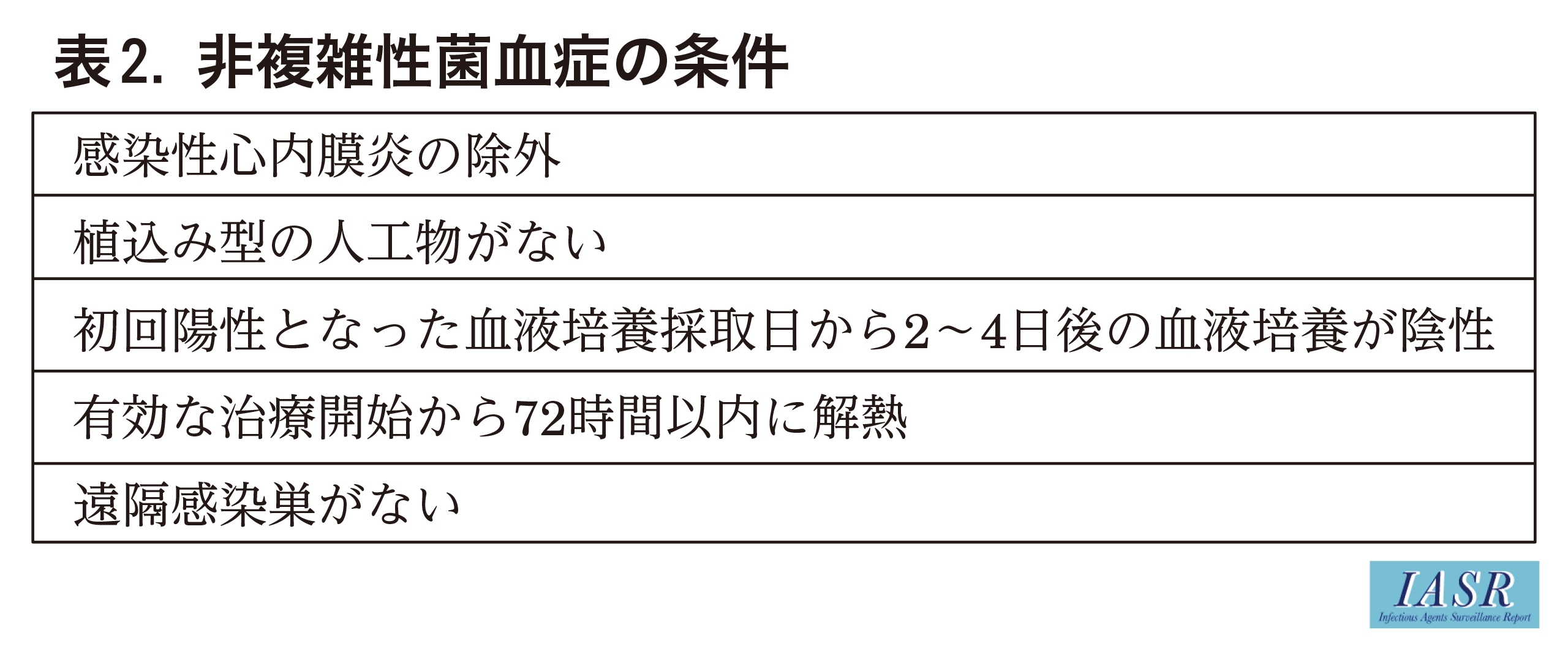 MRSA菌血症の治療期間は、感染巣によって異なる。通常、MRSAを含むS.aureus菌血症の治療期間は、血液培養陰性化から4~6週間である5,8)。しかし、表2のような条件をすべて満たせば非複雑性菌血症と呼ばれ、治療期間を2週間まで短縮できる可能性が報告されている5,8)。