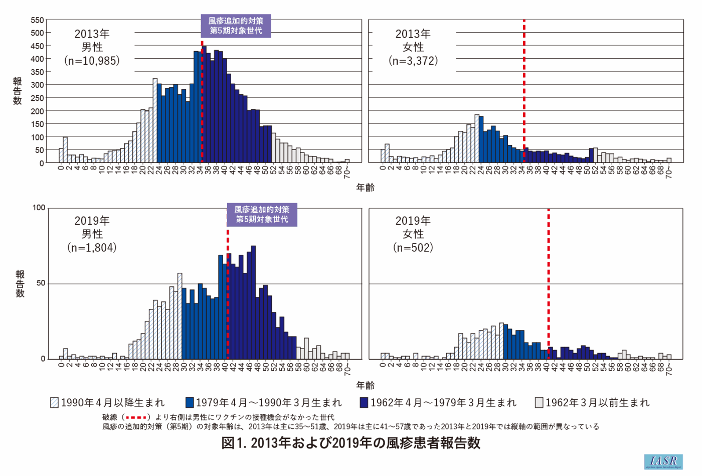 これまで日本では、風しん含有ワクチンの接種は1977年から定期接種ワクチンとして利用され、対象年齢の変更や接種回数の追加等の複数回の接種スケジュールの変更と、第3期〔2008年4月1日~2013年3月31日まで中学校1年生相当年齢に対して麻しん風しん混合ワクチン(MRワクチン)の接種を提供〕、第4期(2008年4月1日~2013年3月31日まで高校3年生相当年齢に対してMRワクチンの接種を提供)接種等の追加的対策が行われてきた1)。しかしながら、その後も2012~2013年にかけて16,000例を超える流行や、2018~2019年に5,000例を超える流行が確認されている。これらの流行では、患者の主体は成人で、しかも患者は男性が女性に比べて約4倍多く報告されていた2)。特に風しん含有ワクチンの接種機会が女性にのみ提供された世代では、患者報告数は8.4倍(2013年)~9倍(2019年)、男性の方が多かった。そのため風しん含有ワクチンの接種機会が一度も提供されてこなかった昭和37年4月2日~昭和54年4月1日(1962年4月2日~1979年4月1日)に出生した男性集団に対して2019年度から第5期接種対象者として接種機会の提供が行われている。しかしながら、接種機会が提供されているにもかかわらずワクチン接種スケジュールの移行期にあたる一部の男性年齢集団で想定されるより患者報告数が多く報告されている(図1)。