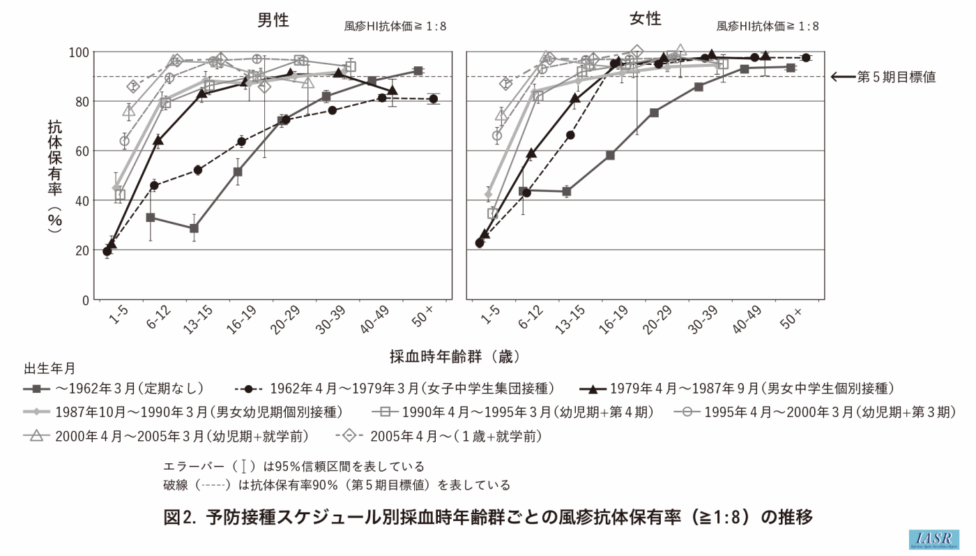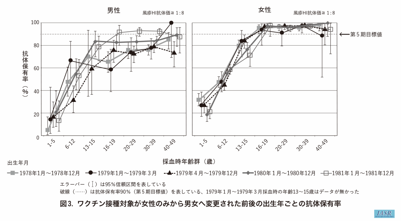 1972~2022年度の感染症流行予測調査で得られた、延べ155,964名の抗風疹赤血球凝集抑制抗体の保有状況のデータを用いた。抗体保有率を風疹のワクチン接種スケジュールごとに8グループに大別して比較した〔出生年月が1962年3月以前(ワクチンの接種機会無し)、1962年4月~1979年3月(中学生女子1回接種かつ集団接種)、1979年4月~1987年9月(男女中学生に1回個別接種)、1987年10月~1990年3月(幼児期男女に1回接種)、1990年4月~1995年3月(幼児期、4期の2回接種)、1995年4月~2000年3月(幼児期、3期の2回接種)、2000年4月~2005年3月(幼児期、就学前の2回接種)、2005年4月以降(原則1歳、就学前の2回接種)〕。