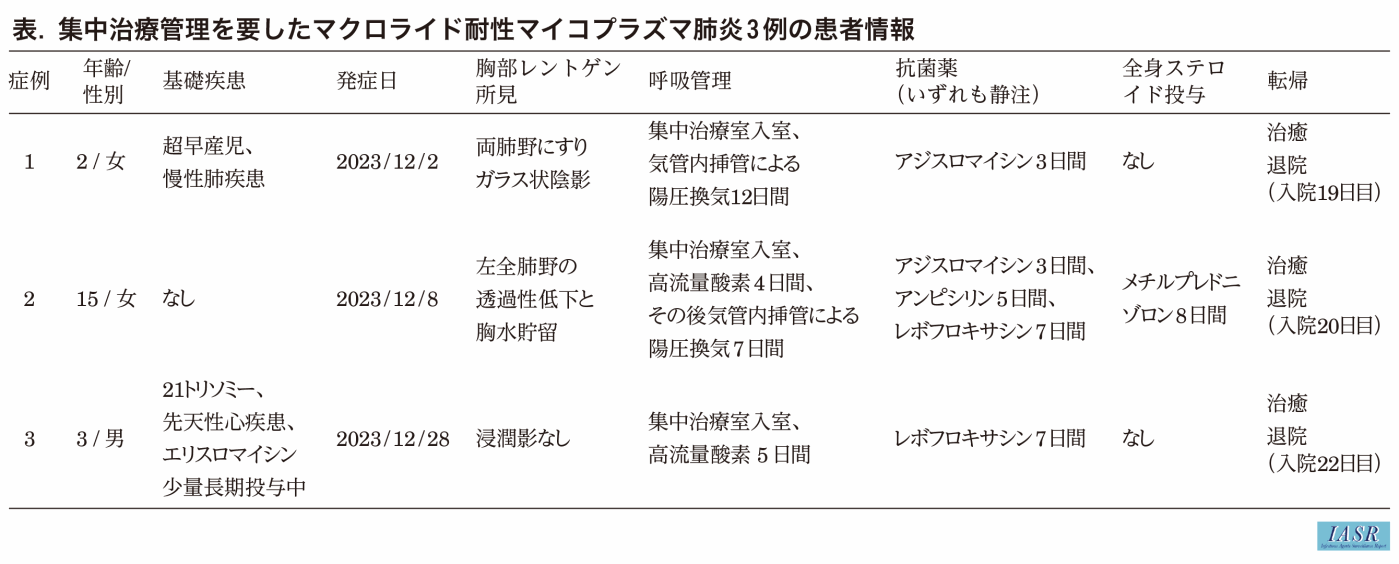 今回、そのようなネットワークで単一医療機関におけるマクロライド耐性マイコプラズマ重症肺炎の症例集積を探知した。国立感染症研究所実地疫学専門家養成コース研修員が週1回、小児感染症診療に従事する有志のネットワークでunusual/unexpectedな症例について臨床像や治療経過の議論をしている(個人情報は含まない)。その議論を通じて、東京都立小児総合医療センター(以下、センター)において、2023年12月1日~2024年1月31日までに集中治療を要するマイコプラズマ肺炎が3例集積し、これらの症例すべてで検出されたMycoplasma pneumoniae(M. pneumoniae)がマクロライド耐性であることが判明した(表)。以下に症例の経過を抜粋する。