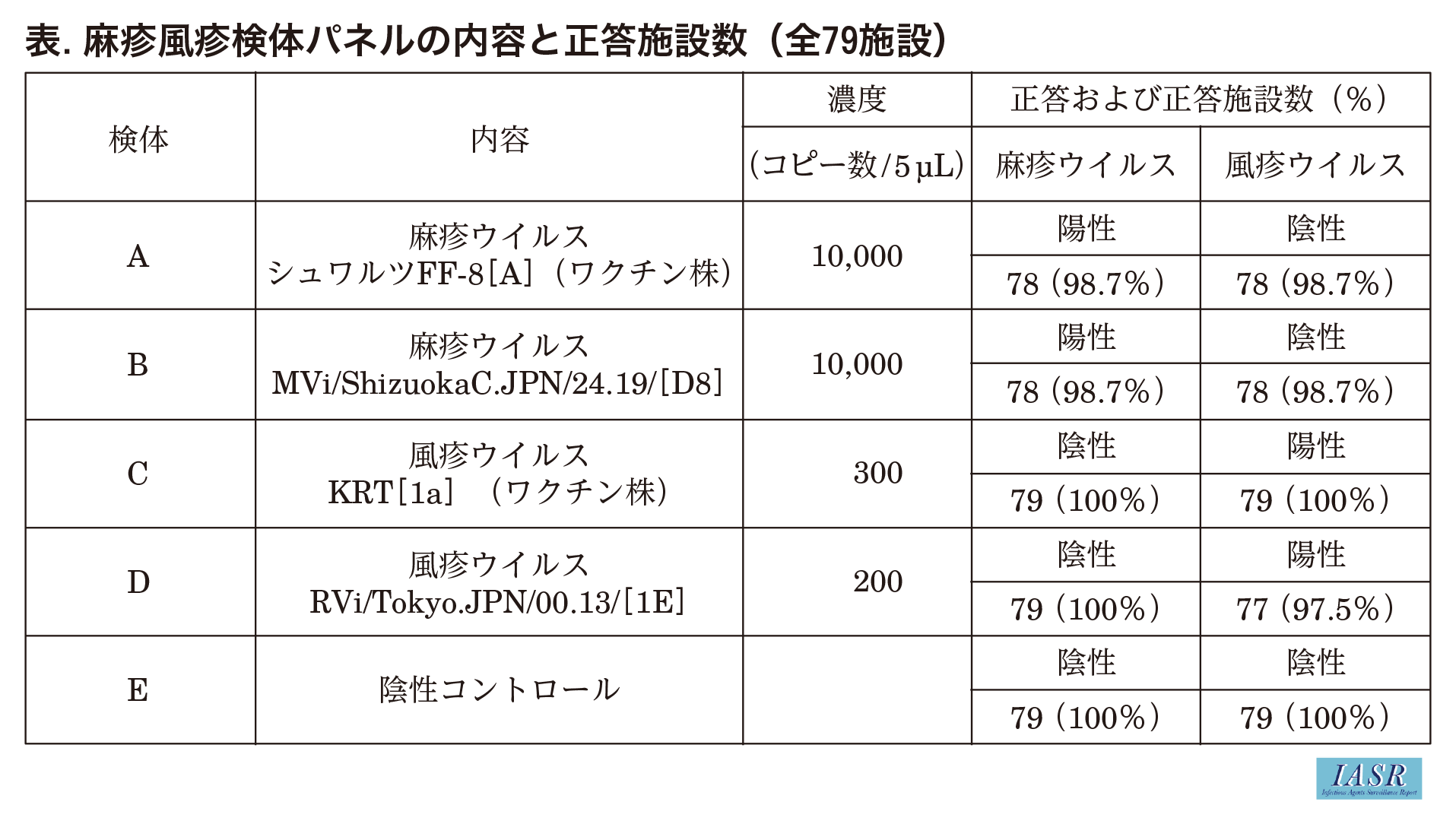 各ウイルスの陽性および陰性の判定について、全5検体で正答であったのは、79施設中76施設(96.2%)であった。誤答があった3施設(3.8%)のうち2施設においては、風疹ウイルス陽性1検体を「陰性」と回答していた。他の1施設においては、麻疹ウイルス陽性2検体を「麻疹ウイルス陰性・風疹ウイルス陽性」と回答していた(表)。