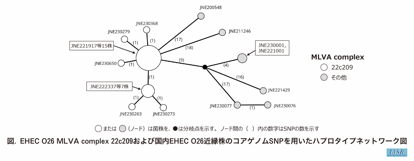 系統解析の結果、同MLVA型の株から30カ所以内の単一塩基多型(single nucleotide polymorphism: SNP)を示す株を図に示す。22c209に属する株は、いずれも最大で3カ所以内のSNPを有するクラスターを形成した。22c209以外で最も近縁であった国内株は、2022年に分離された2株で、13カ所のSNP(MLVAでは4または6カ所の差異)が存在しており、直接的な関連性は低いと示唆された。以上の結果から、他のヒト由来株における馬肉喫食状況は不明であったものの、生食用馬肉による食中毒由来株と非常に近縁な株が全国的に分離されていることが明らかとなった。