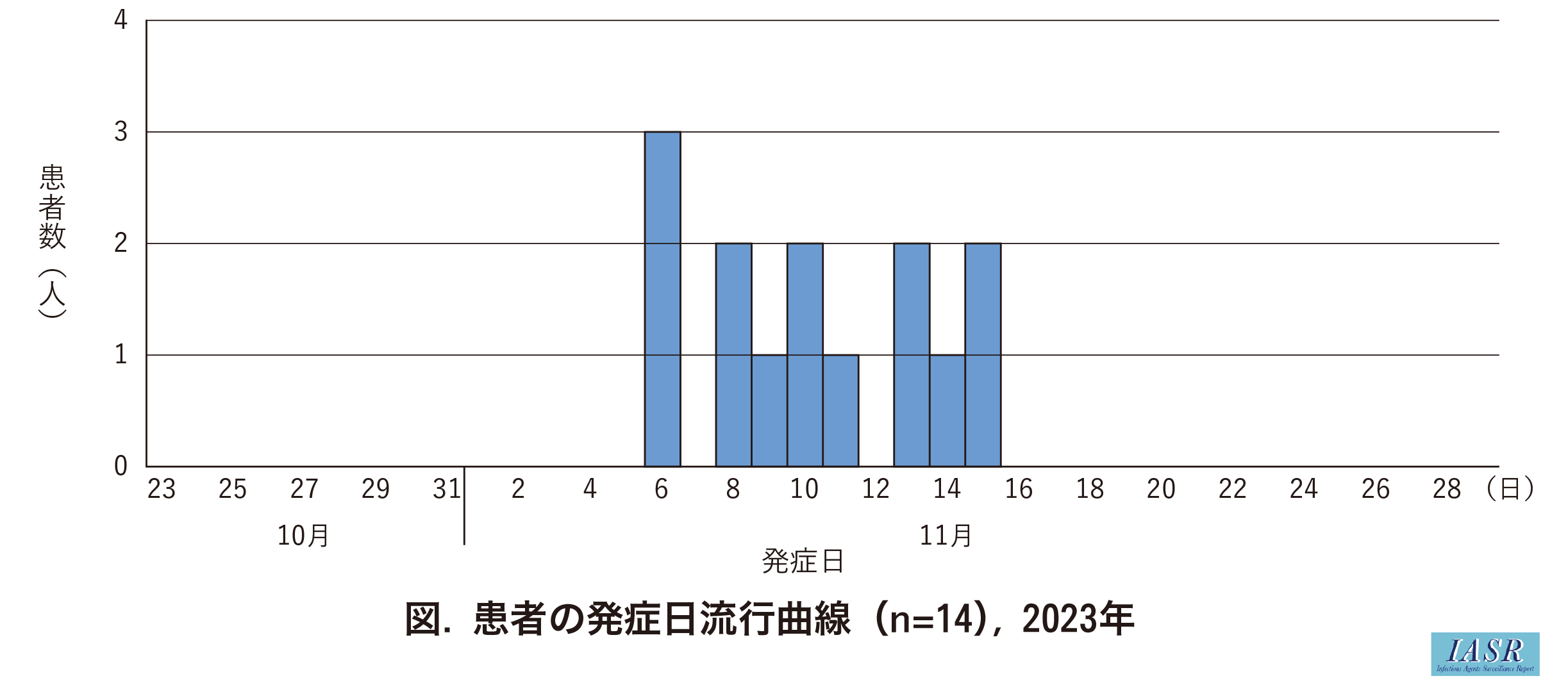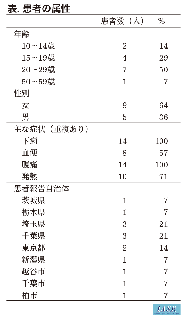 2023年11月14日、東京都内在住者から、越谷市内の飲食店を利用後に体調不良を起こしている旨の電話連絡があった。その後、11月15~24日に、近隣自治体からEHEC感染症発生届患者に関する調査依頼および情報提供が相次ぎ、最終的に患者は1都5県3市の13グループ14名(EHEC感染症届出13名、有症苦情1名)にのぼった(表)。患者の年齢は20~29歳が7名(50%)で最も多く、女性が9名(64%)であった。発症日流行曲線(図)から、患者の発生は11月6~15日にかけて認められたが、HUS等の重症者はいなかった。