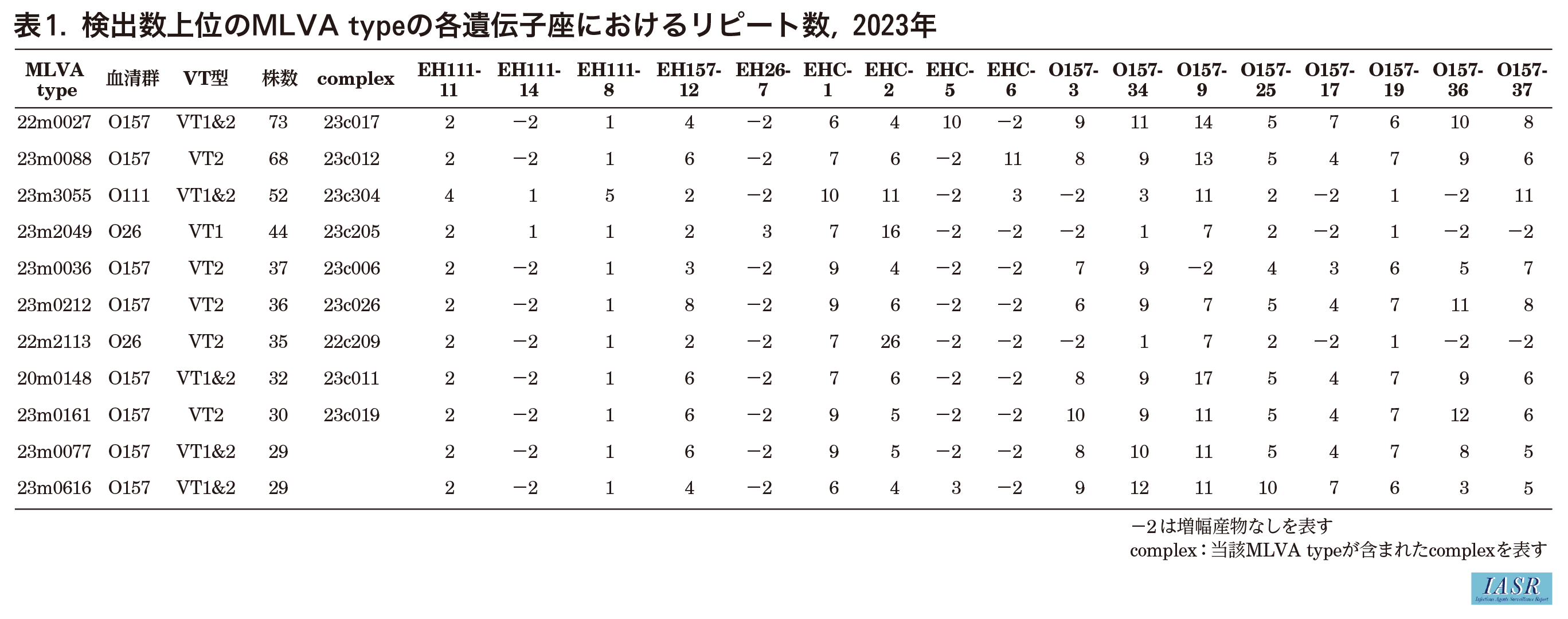 MLVAでは、リピート数が1遺伝子座において異なるsingle locus variant(SLV)など、関連性が推測される型をcomplexとしてまとめる様式をとっている。2023年は110のcomplexが同定された(前後の年をまたぐcomplexを含む)。
