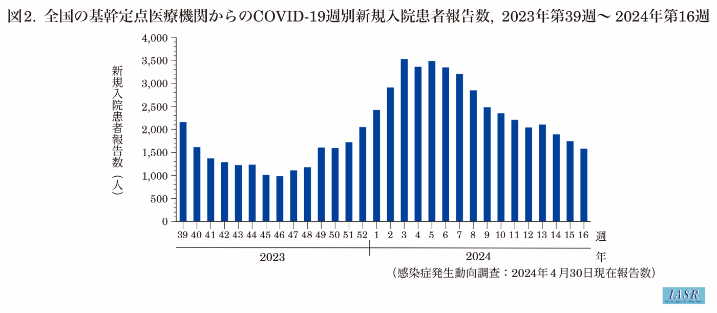 基幹定点医療機関(全国約500カ所の300床以上の病院)からの新規入院患者数の報告は, 2023年第39週(9月25日~10月1日)から開始されて2,160人であった。これまで2024年第3週(1月15~21日)の3,530人が最も多い新規入院患者報告数であった(図2)。