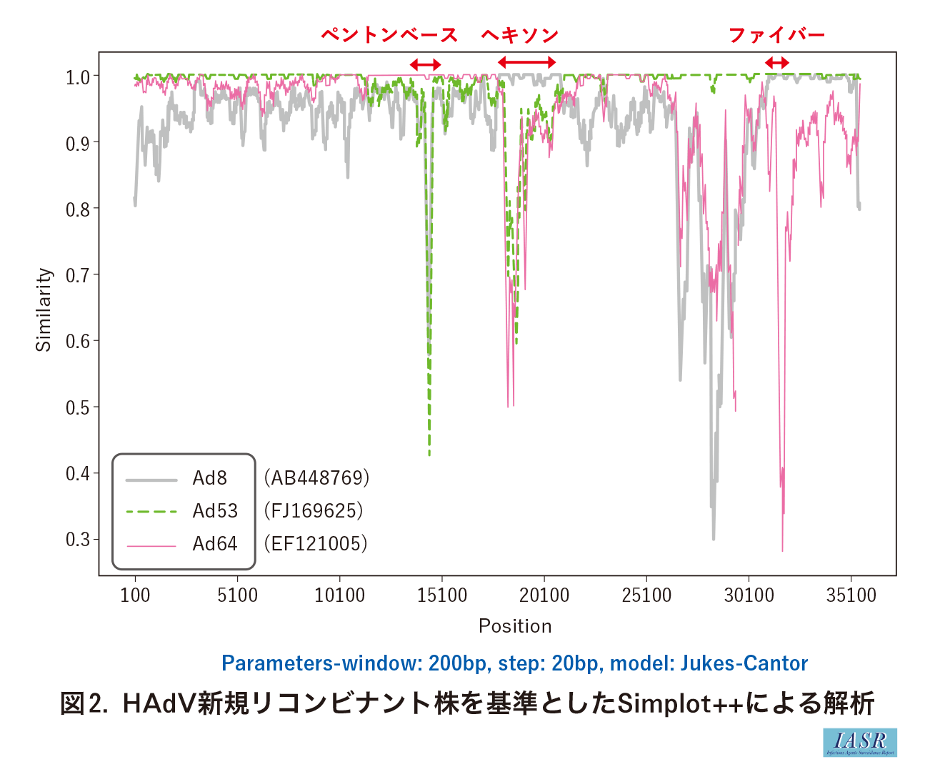 HAdVのリコンビナント発生状況を取りまとめているHuman Adenovirus Working Groupのwebサイト(http://hadvwg.gmu.edu/(外部サイトにリンクします))上では、 2024年4月5日現在、 表に示した型の組み合わせによるリコンビナントの報告はなく、 今回の分離株は新規リコンビナントであると考えられたため、 上記の3領域以外での組み換え状況の確認を目的として、 次世代シーケンサー(NGS)による全ゲノムシーケンスを行った。得られた全長配列を用いて、 分離株に対する各参照株の相同性を可視化するため、 図2に示すとおり、 Simplot++2)による解析を実施したところ、 ペントンベース領域の上流および下流についても64型と高い相同性を示した。これらの領域ではカプシドや核タンパク質の形成に関与するp3a、 p7、 p5、 p10、 p6などのタンパク質がコードされており3)、 ペントンベース領域と同様に組み換えが起こったと推察される。また、 これらの領域およびヘキソン領域を除いてはHAdV-53型[P37H22F8]との相同性が高く、 今回分離された株はHAdV-53型由来のリコンビナント株であることが示唆された。