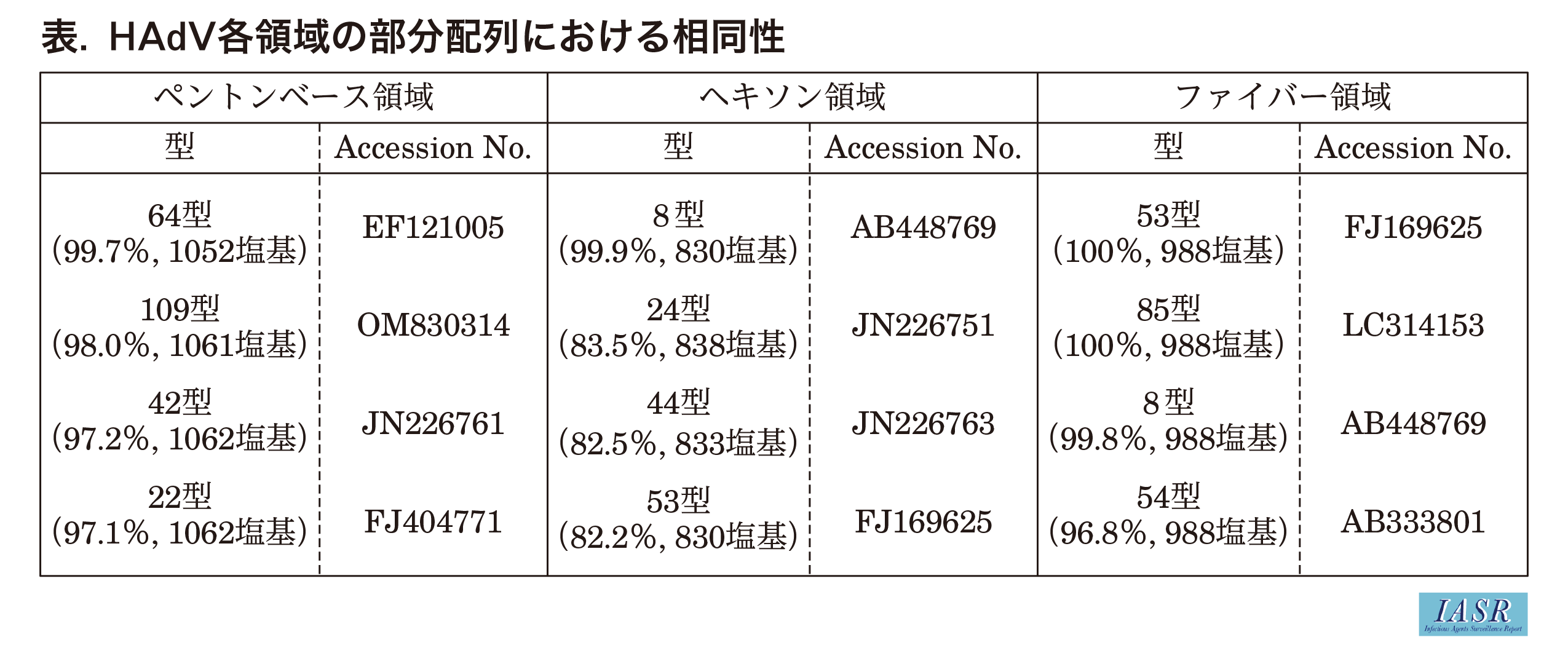 感染症発生動向調査として採取された結膜ぬぐい液について、 ウイルス分離および遺伝子解析を行った。ウイルス分離については、 A549細胞において細胞変性が確認されたため、 HAdV中和用抗血清(デンカ)を用いて中和試験を実施したところ、 8型と同定された。遺伝子解析については、 病原体検出マニュアル1)に従い、 HAdVの主要な構造タンパクをコードするペントンベース(P)、 ヘキソン(H)、 ファイバー(F)の3領域についてダイレクトシーケンスにより部分配列を決定し、 参照株との相同性解析を実施したところ、 表に示す株と高い相同性を示した。各領域で最も高い相同性を示した型で病原体検出マニュアル記載のPHF表記を行うと、 [P64H8F53]または[P64H8F85]となる。また、 各領域の系統樹解析の結果は図1のとおりであった。