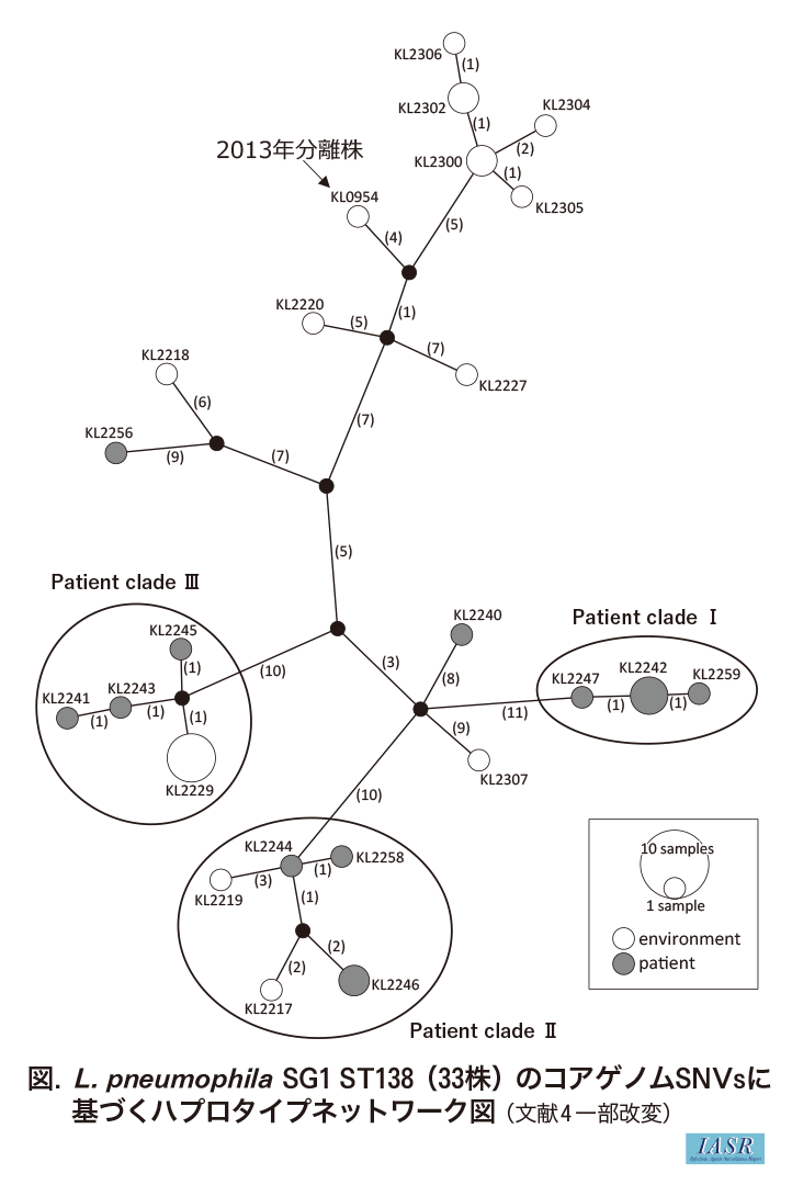 同一患者由来株間のSNVsは0-41個と多様であったことから、 浴槽などエアロゾルが発生する環境に長時間滞在することで、 環境に存在する多様な株に曝露された可能性が考えられた。その一方で、 患者株と近縁な環境由来株が分離できていないクレードが存在していたことから、 感染源特定のためには、 種々の環境からレジオネラ属菌を分離することに加え、 状況に応じて複数の患者分離株を解析に加える必要があると考えられた。
