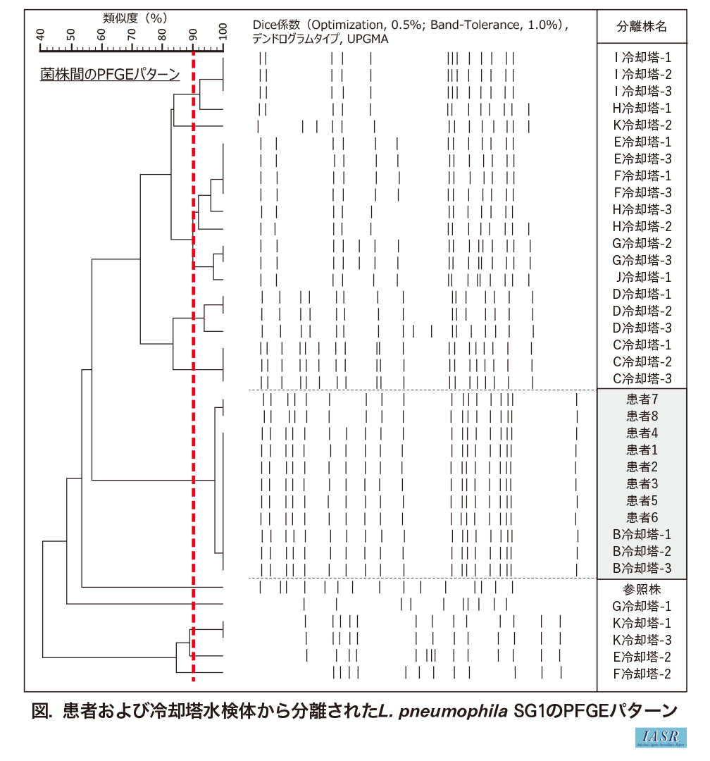 PFGEの結果、 患者由来株8株とB冷却塔由来株3株の泳動像が、 類似度90%以上を示した(図)。SBTの結果、 患者由来株7株とB冷却塔由来株の遺伝子型(flaA: 2, pilE: 10, asd: 18, mip: 15, mompS: 25, proA: 5, neuA: 6)が一致した。患者由来株1株(患者5)については、 1遺伝子領域(flaA: 1)を除いて一致した。なお、 該当するsequence typeの登録はなかった。