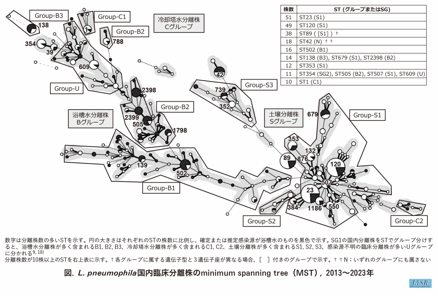 国立感染症研究所細菌第一部レジオネラ・レファレンスセンターにおいて収集されたレジオネラ臨床分離株712株(分離年が2013~2023年の菌株)のうち、 702株がL. pneumophila〔血清群(SG)1(630株)、 SG2(19株)、 SG3(12株)、 SG4(2株)、 SG5(8株)、 SG6(11株)、 SG7(2株)、 SG8(3株)、 SG9(7株)、 SG10(5株)、 SG13(2株)、 SG14(1株)〕であった。L. pneumophila 702株においてSBT法を実施したところ、 243種類のSTに分けられた(図)。そのうち、 分離株数が3株以下のSTが202種類と多くを占め、 SBT法の疫学的有用性が確かめられた。しかし、 いくつかの特定のST(例えば、 ST23は51株、 ST120は49株、 ST89は38株、 ST42は18株分離されている)においては臨床からの分離頻度が高いため、 本法のみでは識別力に欠け、 他の分子疫学解析と組み合わせて調査する必要がある。