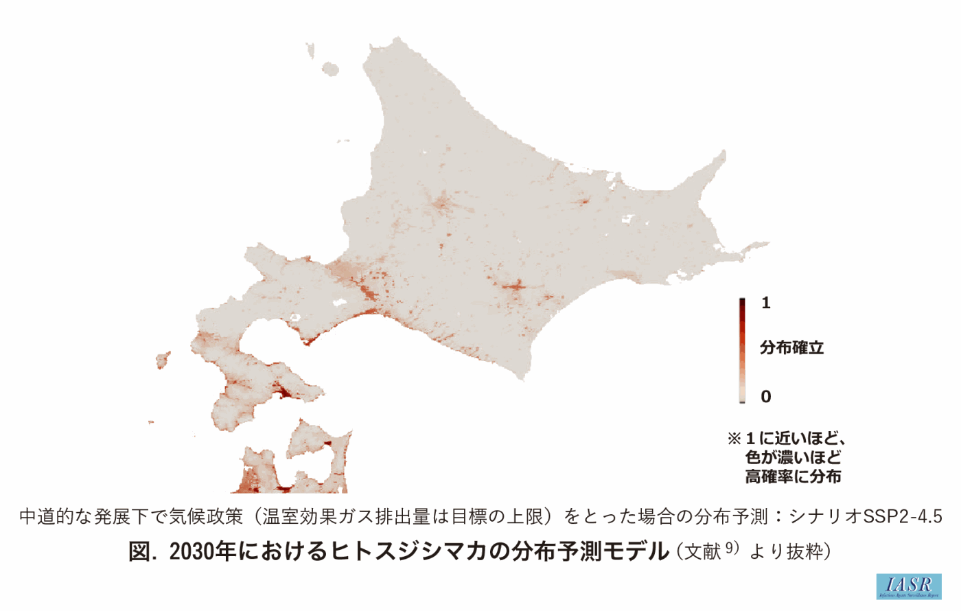 Yangらは、 機械学習の1つであるthe random forest modelで気象・環境要因を解析し、 気候変動の進行予測に基づき、 将来、 日本においてヒトスジシマカの分布がどのように変化するかを調べた9)。それによると、 (1)ヒトスジシマカは、 日本においては森林地帯よりも都市部に生息している、 (2)気温、 都市化に関するパラメーターが分布を決める要因として重要である、 (3)現状に最も近い中道的な発展下で気候政策(温室効果ガス排出量は目標の上限)をとった場合、 気候変動や環境変化で分布は徐々に拡大し、 2030年には北海道札幌市周辺、 小樽市、 苫小牧市、 室蘭市、 函館市、 帯広市などの都市部に定着してもおかしくないことを示している(図)。航空機、 船舶、 鉄道のネットワークが発達し、 人流、 物流の多い札幌市、 苫小牧市、 函館市では、 特にヒトスジシマカの侵入監視が必要であると考えられる。