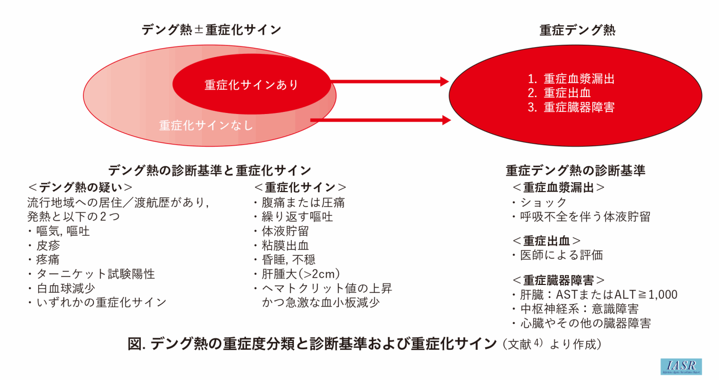 DENV感染者の約60-80%は無症候性感染であるとされ3)、 デング熱は3~7日(最大2~14日)の潜伏期間を経て、 突然の発熱で発症する。臨床経過は発熱期、 重症期、 回復期の3つの段階が知られている。
