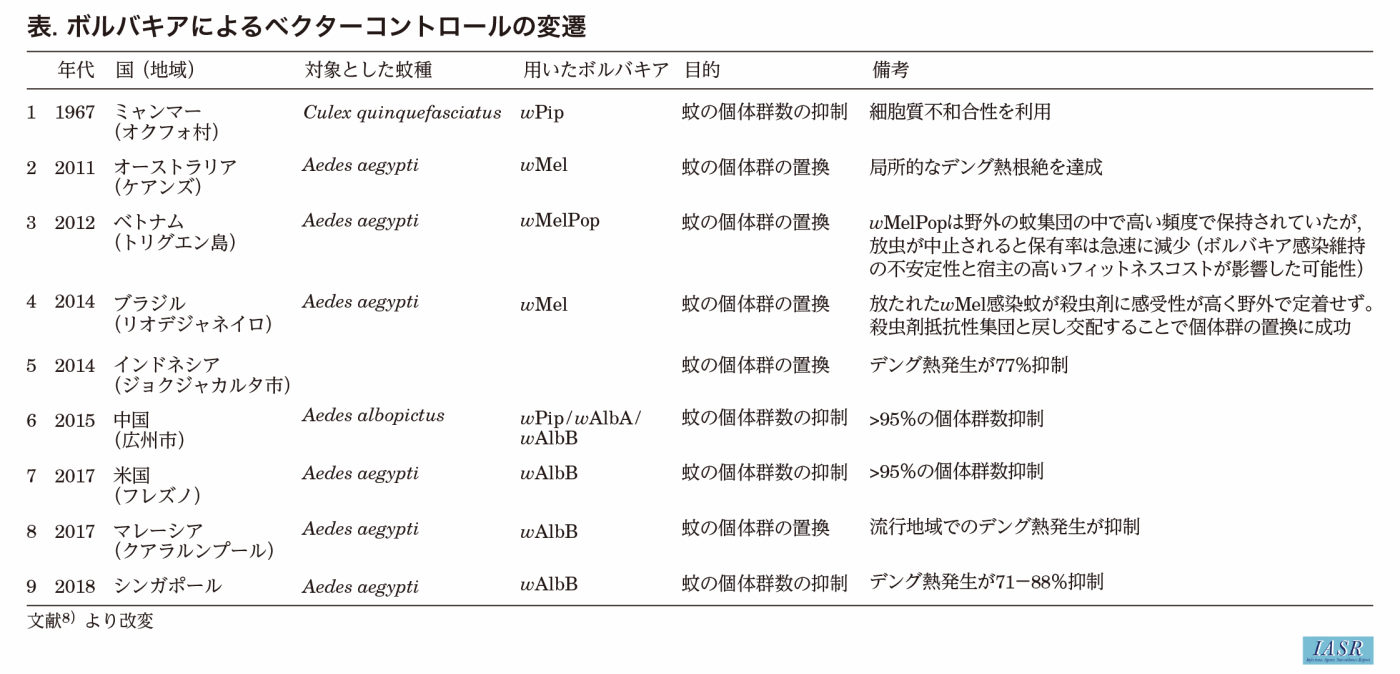 生物的防除資材としてのボルバキアの利用については、 1)ボルバキアによる細胞質不和合作用を利用して野外の蚊の個体数密度を低下させる、 2)ボルバキアによる病原体の増殖抑制作用を利用して野外の蚊集団を病原体媒介能のない集団へ置換する、 という2つの目的に大別される。これまでに行われたボルバキアによる媒介蚊制御の野外実証試験について主なものを表に示した8)。早くは1967年にミャンマーのオクフォ村において、 フィラリアやウエストナイルウイルスの媒介蚊であるネッタイイエカ(Culex quinquefasciatus)に本蚊種由来のボルバキア種wPipを感染させ、 これによる細胞質不和合によって蚊の個体数を低減させようとする試みが行われている。その後、 ボルバキアの利用拡大の大きな転機となったのは、 2009年のボルバキアによる病原体増殖抑制機構の発見と、 2010年にオーストラリア連邦科学産業研究機構(CSIRO)がボルバキア利用による媒介蚊制御法を低リスクと評価したことである。2011年にはオーストラリア北部のケアンズにおいて、 ショウジョウバエ由来のボルバキア種wMelを移入したネッタイシマカを用いて野外蚊集団を置き換えようとする初めての実証試験が行われ、 デング熱の局所的な根絶をほぼ達成している。その後の経過については、 表を参照してほしい。wAlbBとwMelともに他のボルバキアに比べフィットネスコストが低いデータがあり、 実際に実証試験で使いやすいと思われる。データ的にwMelの方が、 wAlbBより温度の影響を受ける報告がある。こうしたボルバキア利用によるデング熱等の疾病媒介蚊対策に関して、 世界規模でのさらなる普及と推進を目的とし、 オーストラリアのモナッシュ大学が中心となってワールド・モスキート・プログラムが設立され、 活動を展開している(https://www.worldmosquitoprogram.org/(外部サイトにリンクします))。
