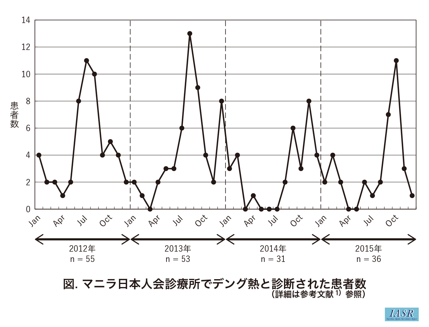 日本では厚生労働省の感染症発生動向調査により、 国内で診断されたデング熱患者数が届出されている。この数は2010年以降増加しており、 2019年は463人にのぼった。一方、 日本からの渡航者が海外でデング熱と診断された数は不明なため、 筆者らはフィリピン・マニラの日本人会診療所におけるデング熱患者数を調査した。この診療所の受診者は、 マニラに在住する日本企業からの駐在員とその家族が大多数を占めている。その結果、 2012~2015年には同診療所で175人のデング熱患者が診断されており、 患者発生は雨期に多い傾向であった1)(図)。マニラでは2011年に在留邦人を対象に「感染症対策講演会」を開催しており、 この参加者を対象にデング熱に関するアンケート調査を行った(回答者76人)。「デング熱の予防をしている」との回答は51人(67.1%)で、 予防をしていない者に理由を質問したところ、 「予防方法が不明」との回答が多かった。