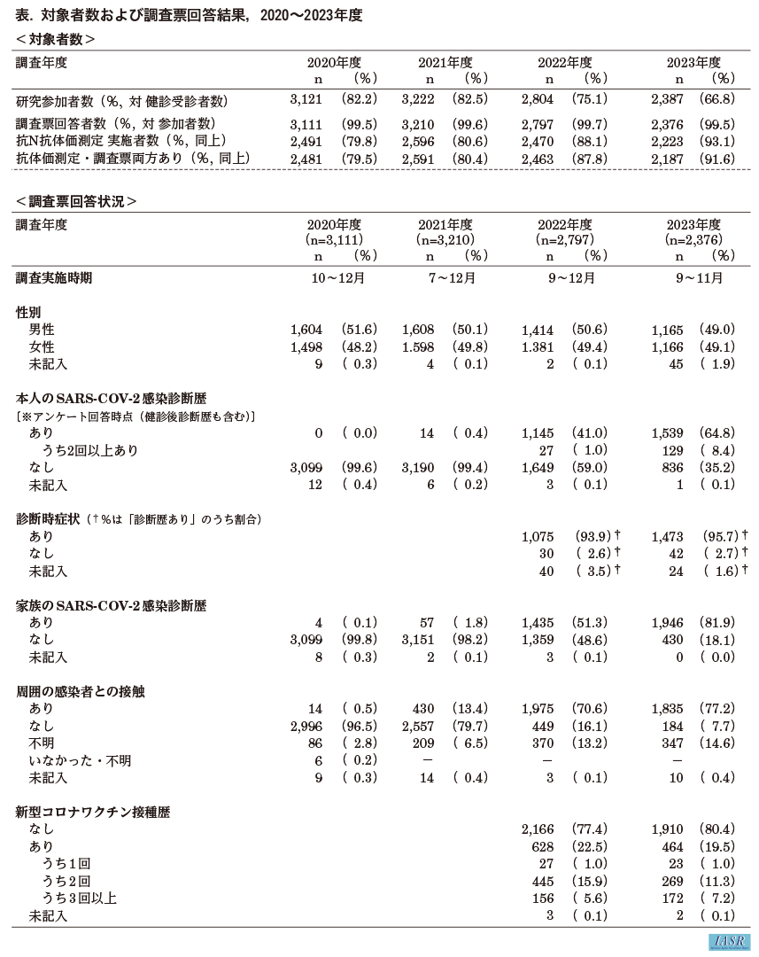 各年度において、 健診は5~12月、 続く質問票調査は7~12月に実施された。対象者数は各年2,387-3,222人(66.8-82.5%)〔( )内は各年度健診受診者数比〕で、 うち99.5-99.7%の対象者から質問票の回答が得られた。