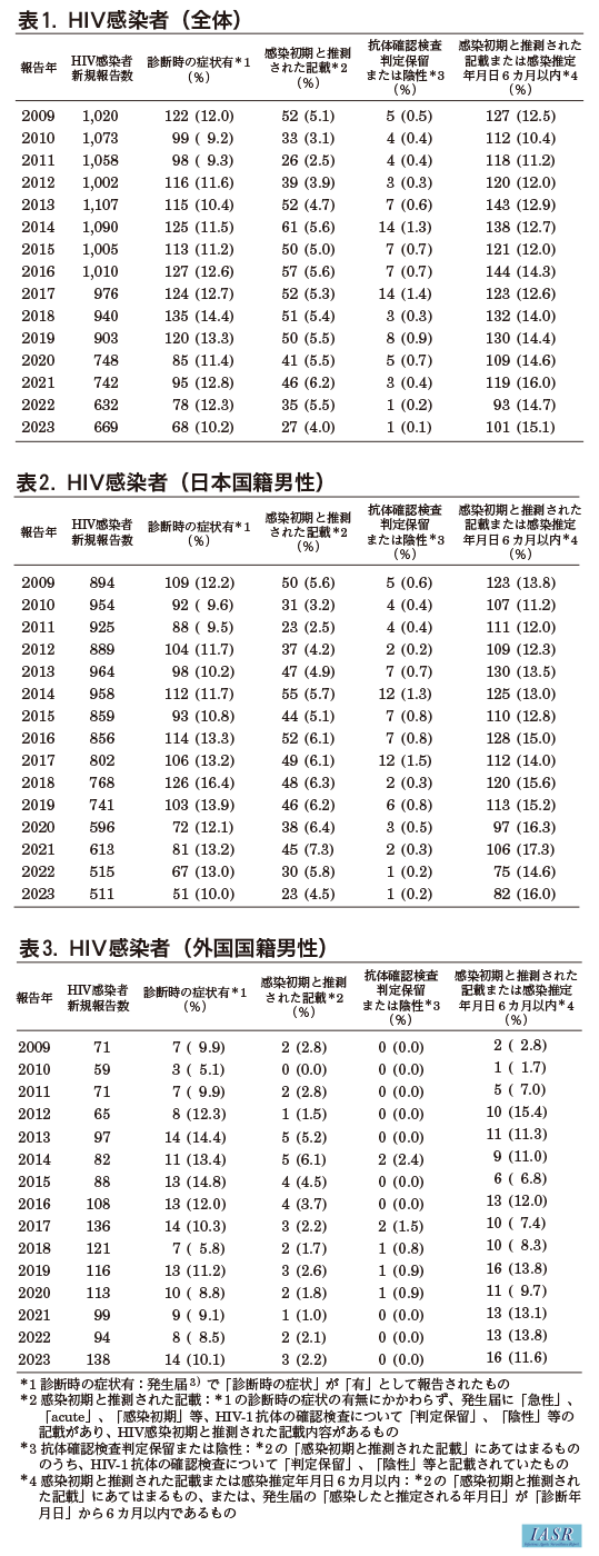 感染症発生動向調査に登録された情報に基づき、 2009~2023年に報告された発生届における診断時の症状の有無、 HIV感染初期と推測された記載等について集計した。