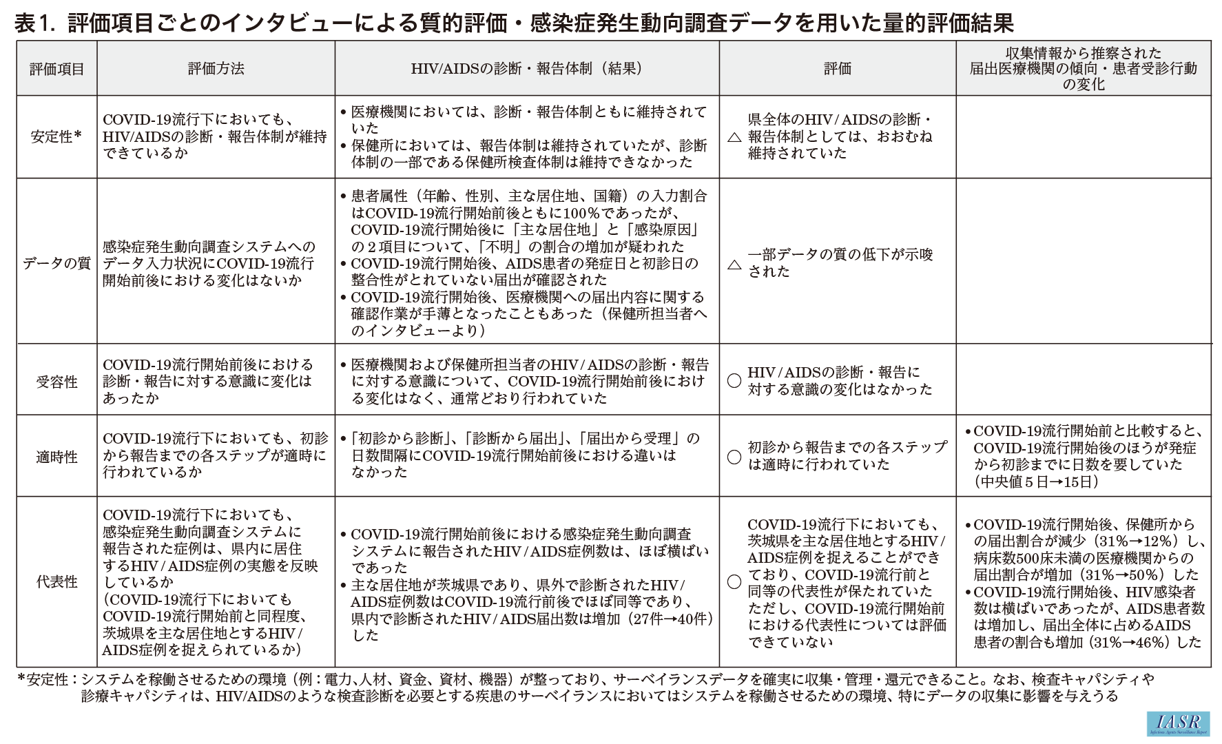 米国疾病管理予防センター(CDC)のUpdated Guidelines for Evaluation Public Health Surveillance Systems5)に準じ、 「安定性」、 「データの質」、 「受容性」、 「適時性」、 「代表性」の5項目について、 医療機関・保健所担当者へのインタビューによる質的評価および本システムのデータを用いた量的評価を行った。HIV感染者とAIDS患者の症例定義は、 厚生労働省エイズ動向委員会の定義に準ずるものとし、 COVID-19流行開始前を2017~2019年、 COVID-19流行開始後を2020~2022年と定義した。(国立感染症研究所 人を対象とする生命科学・医学系研究倫理審査委員会承認受付番号: 1635)