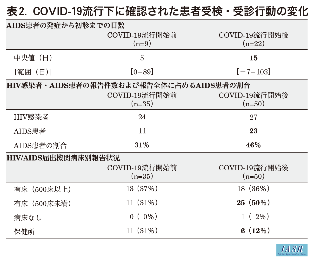 本システムが、 COVID-19流行開始後も適切に機能したことから、 疫学情報に加え、 患者の受診行動の変化(AIDS患者の初診までの日数の延長、 いきなりエイズの割合の増加、 受検・受診先の変化)も捉えられていた。すなわち、 COVID-19流行開始後には、 HIV感染者の探知・治療が遅れていた可能性があると考えられた。保健所検査はHIV感染者の早期探知・治療に寄与していたことが示唆され、 パンデミック下においても維持できるような体制整備が望まれた。
