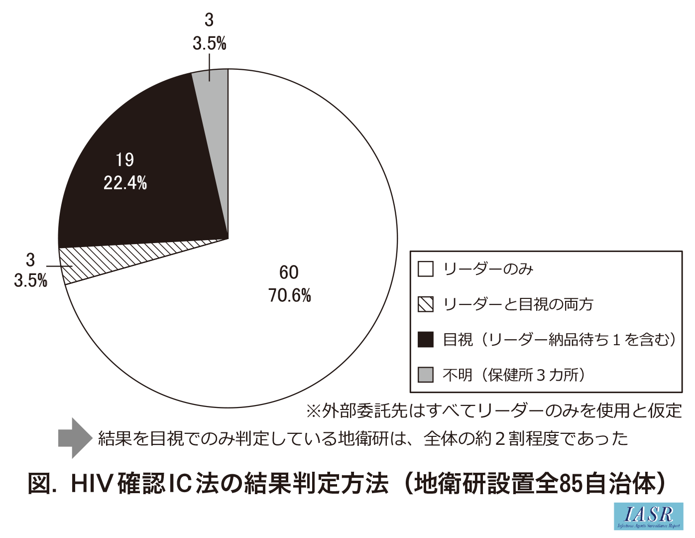33カ所の地衛研のうち、 11カ所(33.3%)が結果判定にリーダーのみを使用し、 3カ所(9.1%)がリーダーと目視の両方により総合的に判定していた。また、 調査時点でリーダーの納品待ちであった1カ所を含む19カ所(57.6%)が目視のみで結果を判定していた。委託先のすべての臨床検査会社がリーダーのみを使用していると仮定すると、 地衛研設置自治体全85カ所中、 60カ所(70.6%)がリーダーのみで結果を判定していることになる(図)。