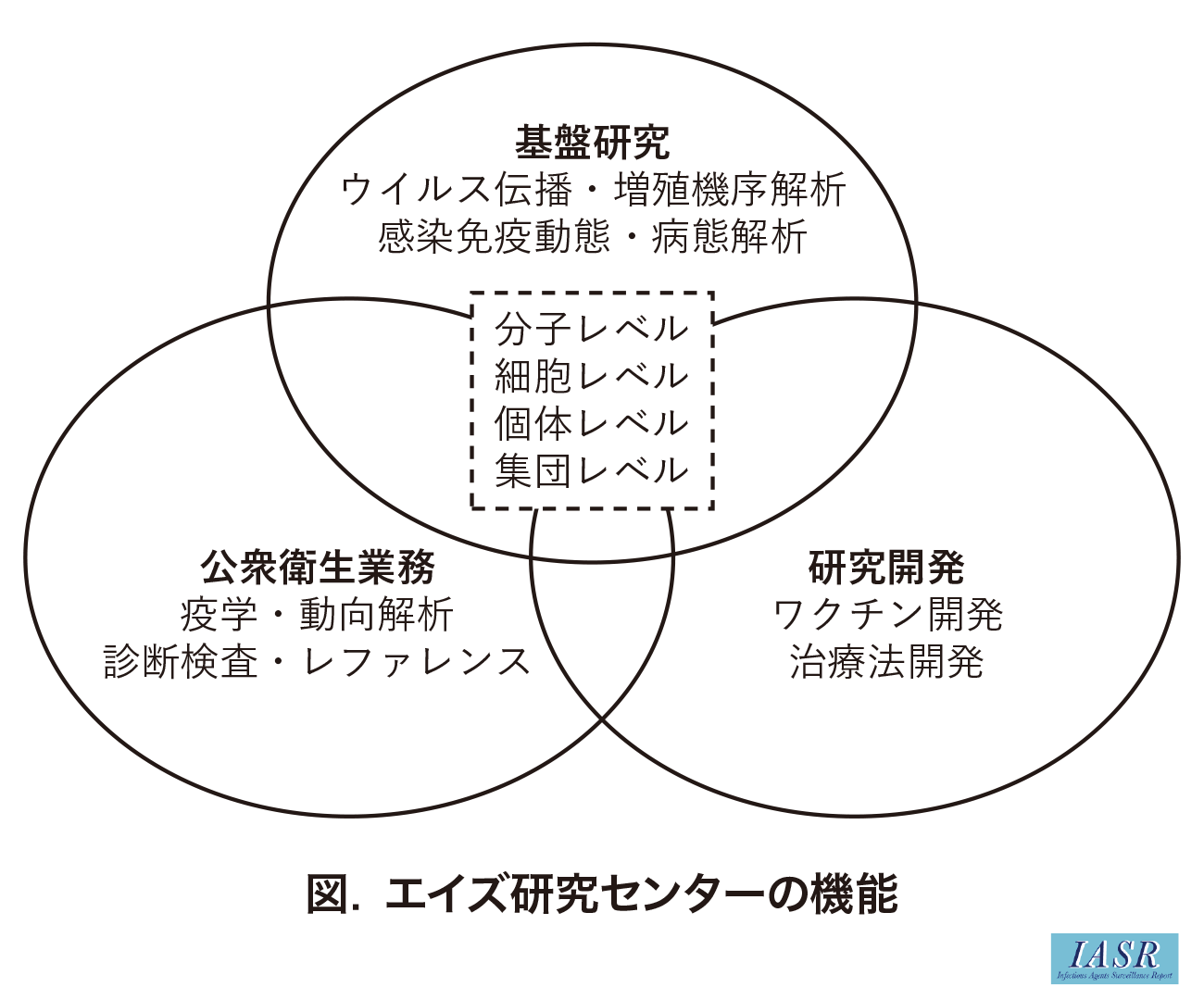 エイズ研究センターの業務は、 大別すると、 基盤研究、 公衆衛生業務、 研究開発に大別される(図)。